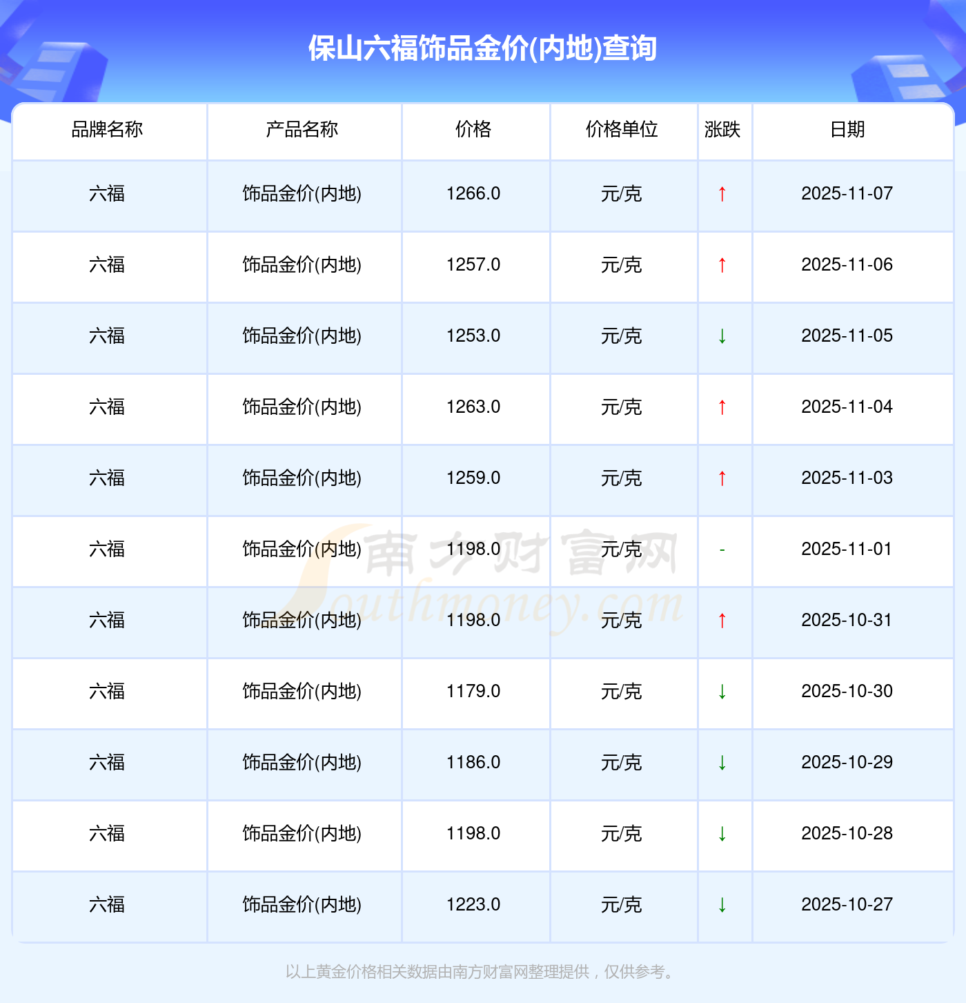 2025年11月9日寶泉錢幣、金蘭首飾、金蘭首飾、謝瑞麟、謝瑞麟、謝瑞麟、謝瑞麟、謝瑞麟、金銀街、金銀街、金銀街等各大金店品牌飾品金價(內(nèi)地)最新價格如下:寶泉錢幣銀條價格11.4元/克,金蘭首飾黃金價格1263.0元/克,金蘭首飾鉑金價格560.0元/克,謝瑞麟金條價格(內(nèi)地)1202.0元/克,謝瑞麟金飾價格(內(nèi)地)1268.0元/克,謝瑞麟黃金飾品(香港)44260.0,謝瑞麟鉑金飾品(香港)13080.0,謝瑞麟金條金價(香港)39960.0,金銀街投資金條1243.0元/克,金銀街工藝金條1258.0元/克,金銀街千足金首飾1248.0元/克。