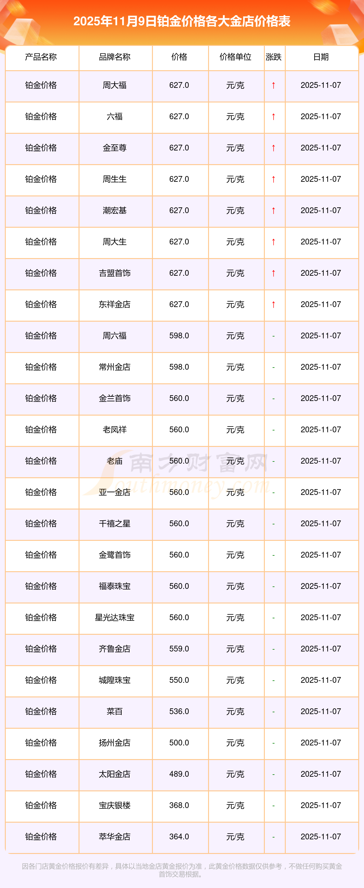 2025年11月9日,寶泉錢幣、金蘭首飾、金蘭首飾、謝瑞麟、謝瑞麟、謝瑞麟、謝瑞麟、謝瑞麟、金銀街、金銀街、金銀街等各大金店品牌鉑金價(jià)格今日價(jià)格如下:寶泉錢幣11.4元/克、金蘭首飾1263.0元/克、金蘭首飾560.0元/克、謝瑞麟1202.0元/克、謝瑞麟1268.0元/克、謝瑞麟44260.0、謝瑞麟13080.0、謝瑞麟39960.0、金銀街1243.0元/克、金銀街1258.0元/克、金銀街1248.0元/克。