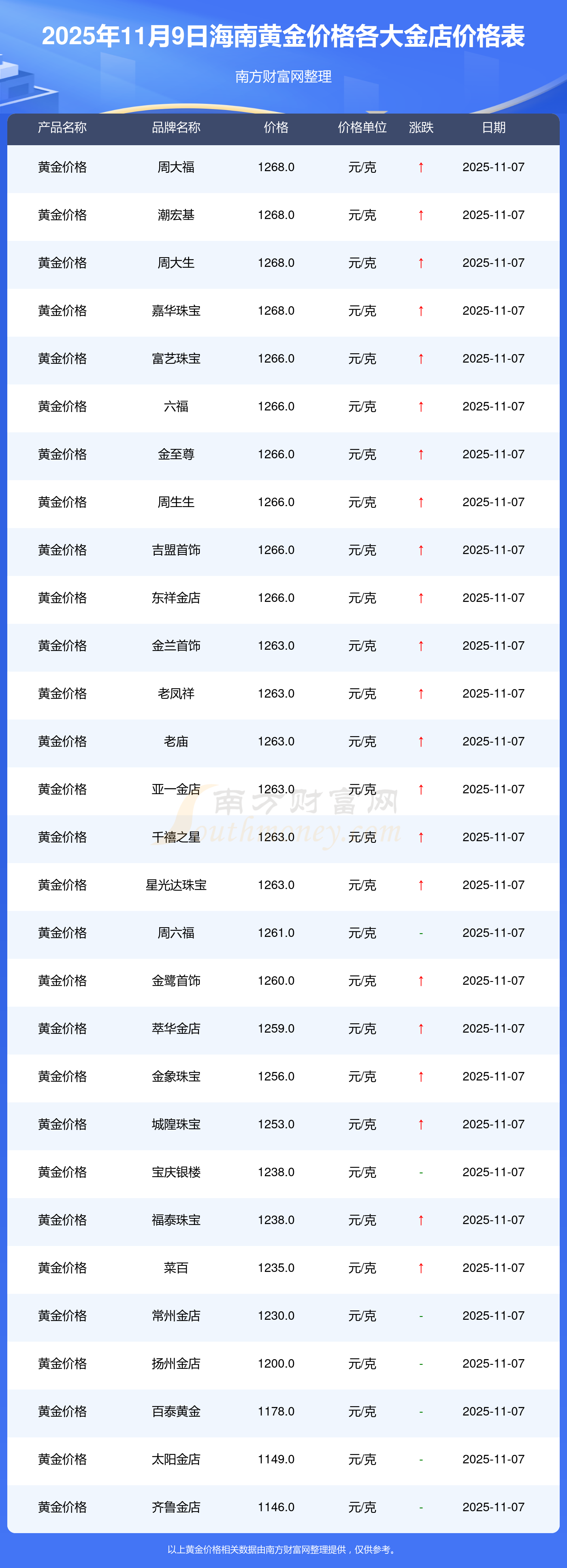 2025年11月9日海南各大金店黃金價(jià)格最新價(jià)格查詢來(lái)了:寶泉錢幣11.4元/克,金蘭首飾1263.0元/克,金蘭首飾560.0元/克,謝瑞麟1202.0元/克,謝瑞麟1268.0元/克,謝瑞麟44260.0,謝瑞麟13080.0,謝瑞麟39960.0,金銀街1243.0元/克,金銀街1258.0元/克,金銀街1248.0元/克。