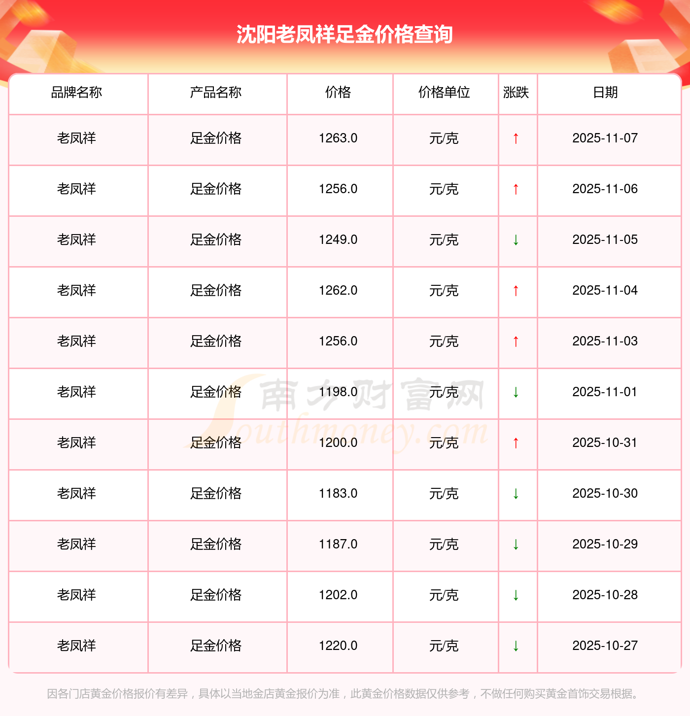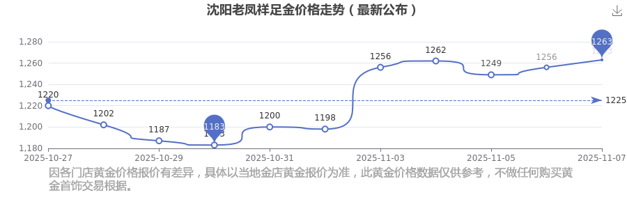 1263.0元/克的足金價(jià)格,是沈陽(yáng)老鳳祥在 2025年11月9日給出的。