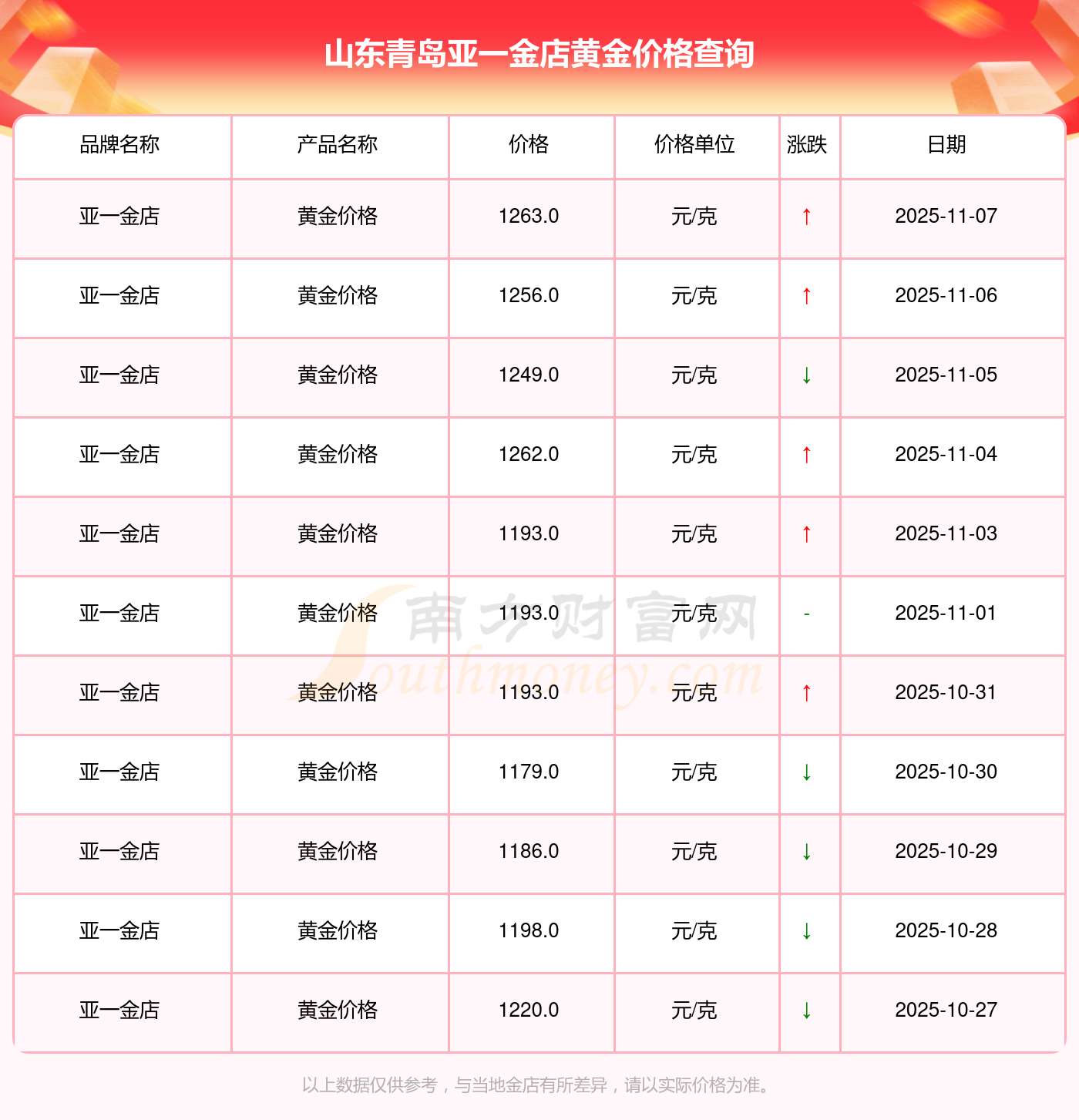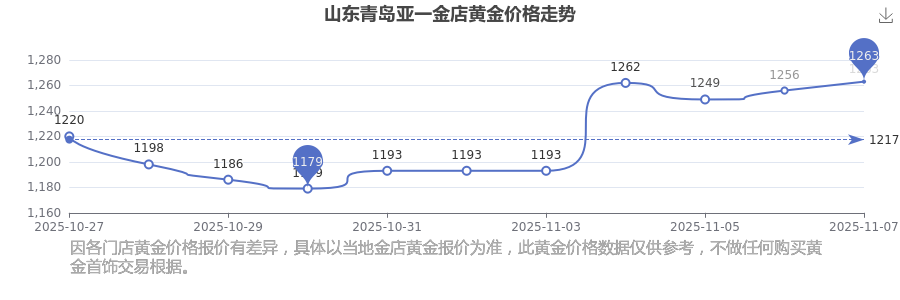 1263.0元/克,此乃山東青島亞一金店于 2025年11月9日黃金價格的掛牌價格。