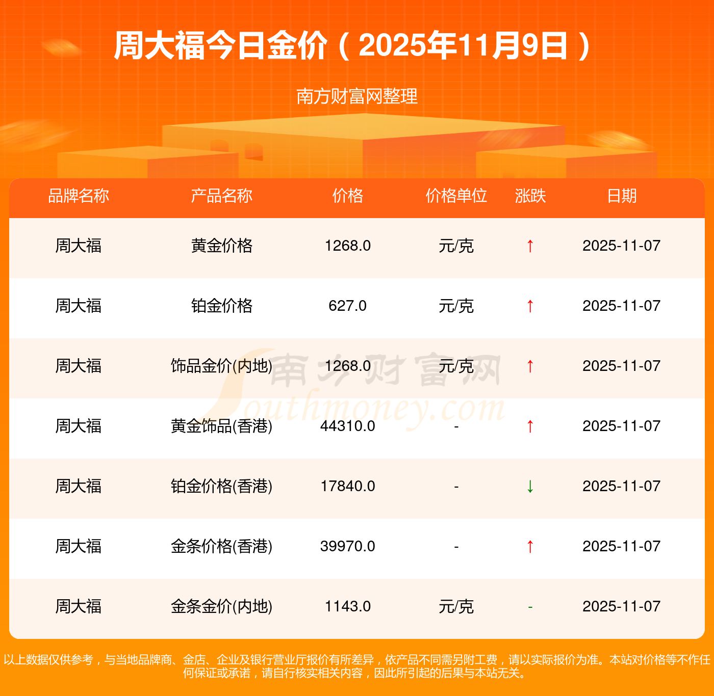 今天是2025年11月9日,寶泉錢幣、金蘭首飾、金蘭首飾、謝瑞麟、謝瑞麟、謝瑞麟、謝瑞麟、謝瑞麟、金銀街、金銀街、金銀街等各大金店品牌金條金價(內地)最新價格如下:寶泉錢幣11.4元/克、金蘭首飾1263.0元/克、金蘭首飾560.0元/克、謝瑞麟1202.0元/克、謝瑞麟1268.0元/克、謝瑞麟44260.0、謝瑞麟13080.0、謝瑞麟39960.0、金銀街1243.0元/克、金銀街1258.0元/克、金銀街1248.0元/克。