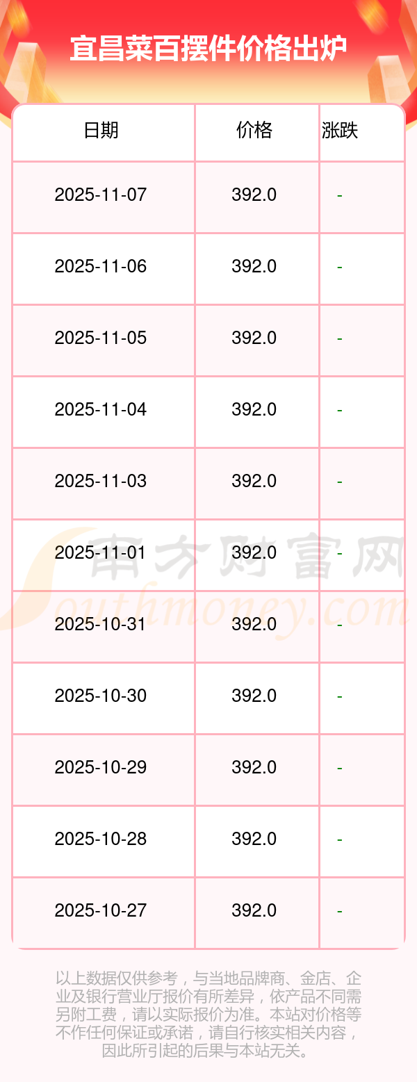 2025年11月9日,宜昌菜百擺件價(jià)格每克的價(jià)值量定格在392.0元/克。