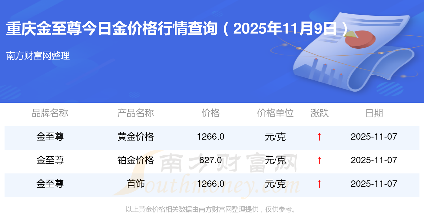 今天黃金價格幾何?現在每克黃金值多少錢?2025年11月9日重慶金至尊黃金按克計價,現在多少錢一克?銀條價格11.4元/克,黃金價格1263.0元/克,鉑金價格560.0元/克,金條價格(內地)1202.0元/克,金飾價格(內地)1268.0元/克,黃金飾品(香港)44260.0,鉑金飾品(香港)13080.0,金條金價(香港)39960.0,投資金條1243.0元/克,工藝金條1258.0元/克,千足金首飾1248.0元/克。