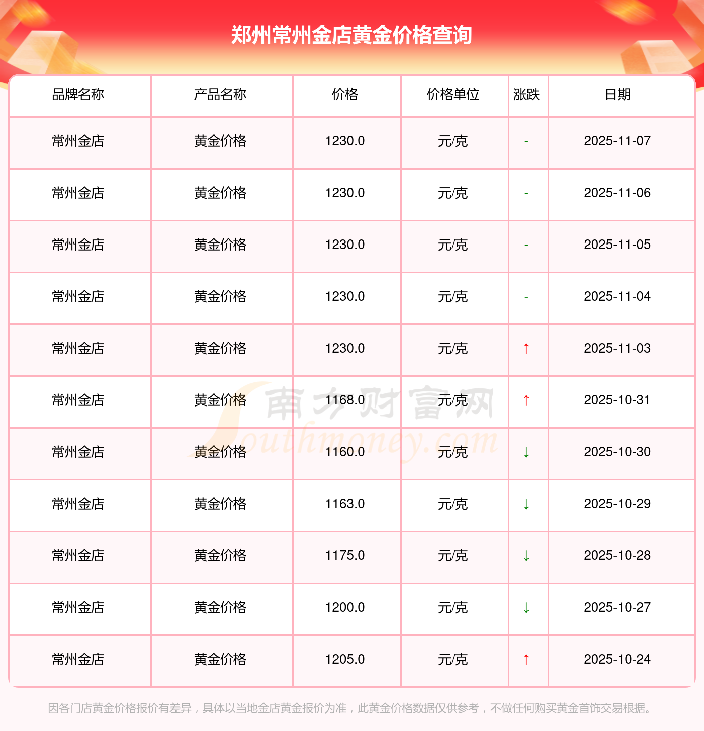 因各門店黃金價格報價有差異,具體以當?shù)亟鸬挈S金報價為準,此黃金價格數(shù)據(jù)僅供參考,不做任何購買黃金首飾交易根據(jù)。