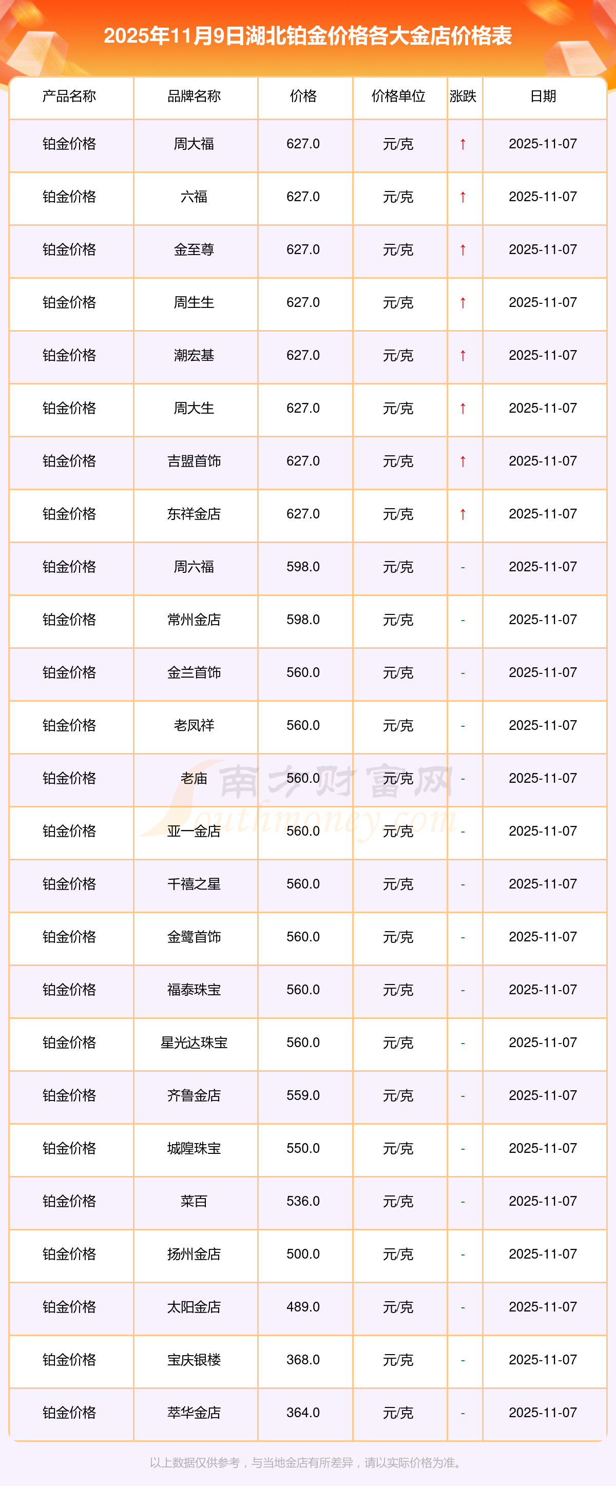 2025年11月9日湖北寶泉錢幣、金蘭首飾、金蘭首飾、謝瑞麟、謝瑞麟、謝瑞麟、謝瑞麟、謝瑞麟、金銀街、金銀街、金銀街等各大金店品牌鉑金價(jià)格最新價(jià)格行情來了,如下:寶泉錢幣銀條價(jià)格11.4元/克,金蘭首飾黃金價(jià)格1263.0元/克,金蘭首飾鉑金價(jià)格560.0元/克,謝瑞麟金條價(jià)格(內(nèi)地)1202.0元/克,謝瑞麟金飾價(jià)格(內(nèi)地)1268.0元/克,謝瑞麟黃金飾品(香港)44260.0,謝瑞麟鉑金飾品(香港)13080.0,謝瑞麟金條金價(jià)(香港)39960.0,金銀街投資金條1243.0元/克,金銀街工藝金條1258.0元/克,金銀街千足金首飾1248.0元/克。