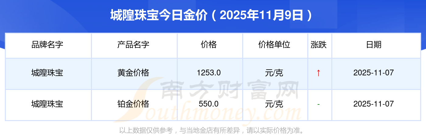 現(xiàn)在城隍珠寶黃金價(jià)格是多少錢1克_2025年城隍珠寶今日金價(jià)是多少錢一克,最新城隍珠寶查詢,2025年11月9日城隍珠寶鉑金價(jià)格現(xiàn)在每克多少錢?最新城隍珠寶鉑金價(jià)格報(bào)價(jià)公布,一起來看看吧!