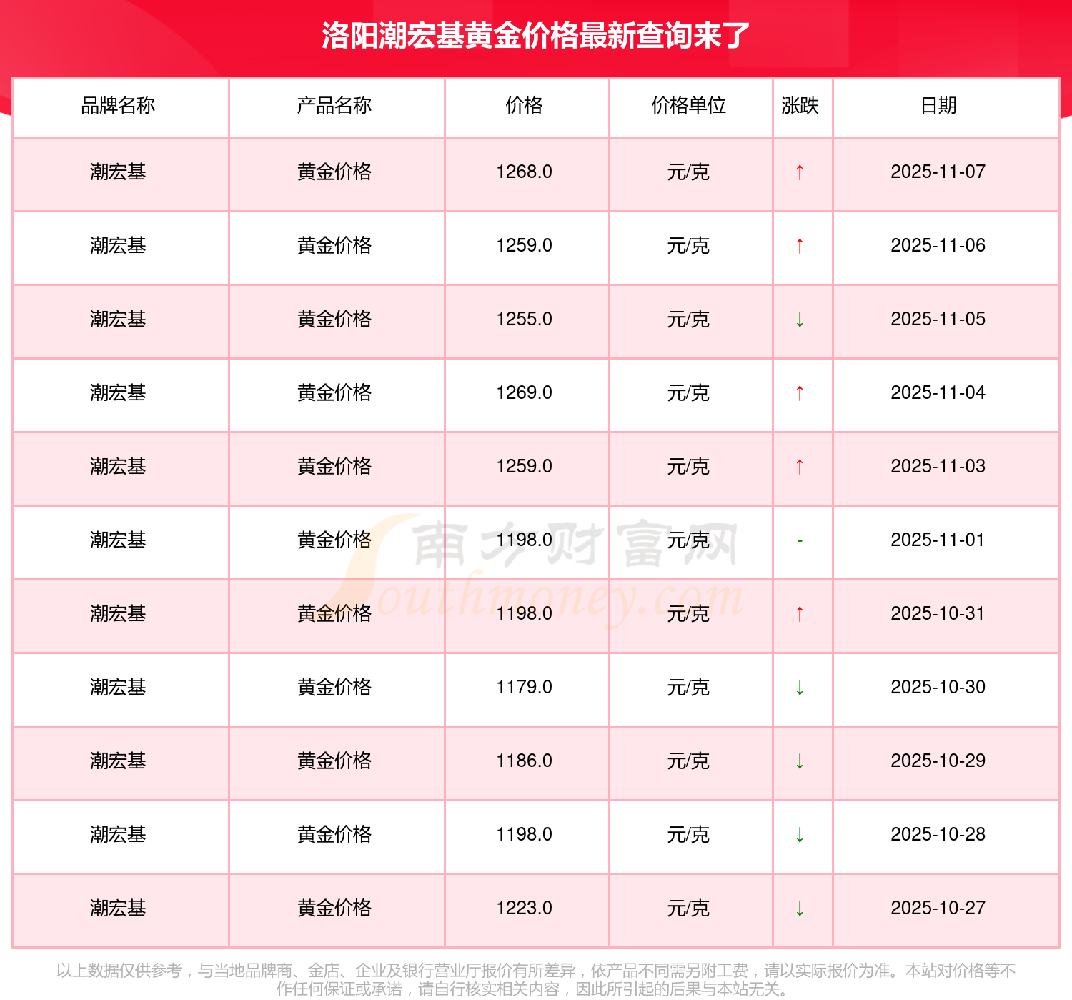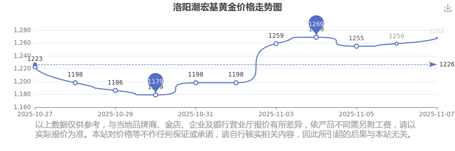 2025年11月9日當(dāng)天,洛陽潮宏基黃金價(jià)格的單價(jià)是 1268.0元/克。