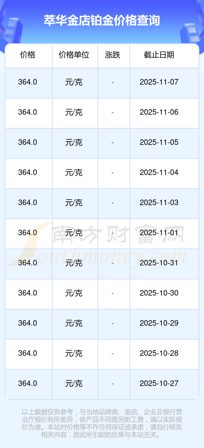 最新數(shù)據(jù)表明,萃華金店今日 鉑金價格為364.0元/克。