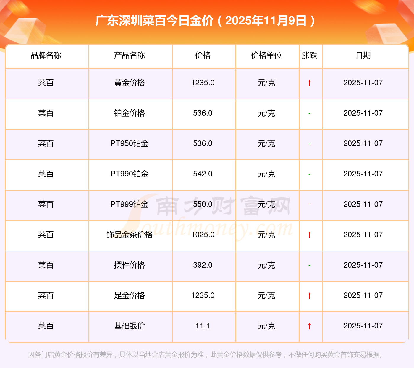 以上數(shù)據(jù)僅供參考,與當(dāng)?shù)仄放粕、金店、企業(yè)及銀行營業(yè)廳報(bào)價(jià)有所差異,依產(chǎn)品不同需另附工費(fèi),請以實(shí)際報(bào)價(jià)為準(zhǔn)。本站對價(jià)格等不作任何保證或承諾,請自行核實(shí)相關(guān)內(nèi)容,因此所引起的后果與本站無關(guān)。