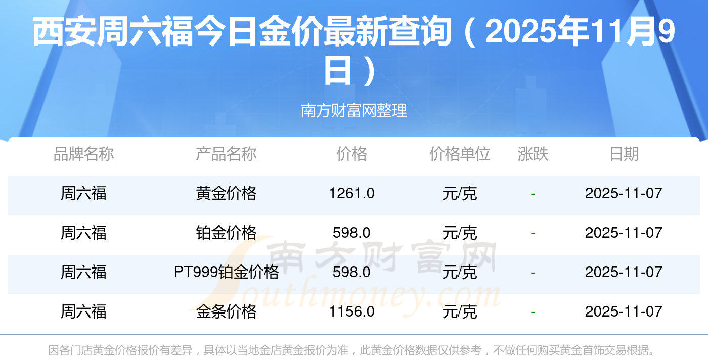 想查詢(xún)今日黃金價(jià)格,當(dāng)下黃金一克具體售價(jià)幾何?2025年11月9日西安周六福現(xiàn)在黃金一克要多少錢(qián):銀條價(jià)格11.4元/克,黃金價(jià)格1263.0元/克,鉑金價(jià)格560.0元/克,金條價(jià)格(內(nèi)地)1202.0元/克,金飾價(jià)格(內(nèi)地)1268.0元/克,黃金飾品(香港)44260.0,鉑金飾品(香港)13080.0,金條金價(jià)(香港)39960.0,投資金條1243.0元/克,工藝金條1258.0元/克,千足金首飾1248.0元/克。
