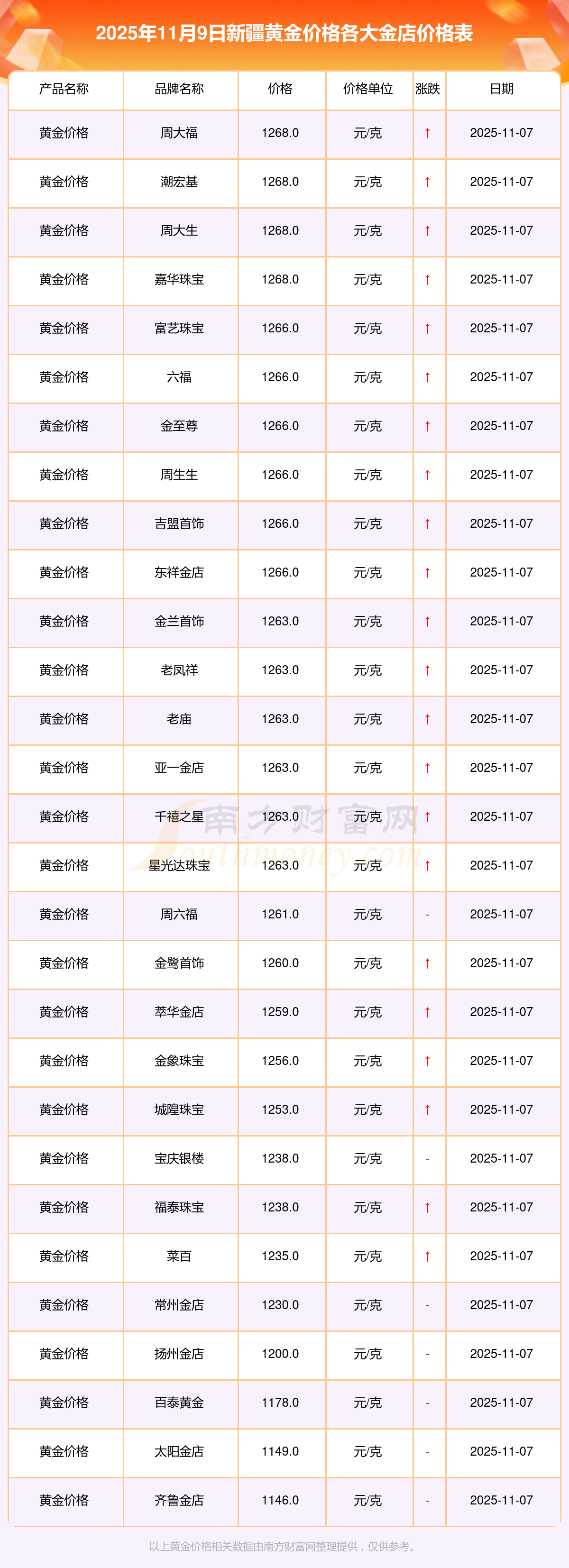 2025年11月9日,新疆寶泉錢幣、金蘭首飾、金蘭首飾、謝瑞麟、謝瑞麟、謝瑞麟、謝瑞麟、謝瑞麟、金銀街、金銀街、金銀街等各大金店品牌黃金價(jià)格今日價(jià)格行情最新來了:寶泉錢幣11.4元/克、金蘭首飾1263.0元/克、金蘭首飾560.0元/克、謝瑞麟1202.0元/克、謝瑞麟1268.0元/克、謝瑞麟44260.0、謝瑞麟13080.0、謝瑞麟39960.0、金銀街1243.0元/克、金銀街1258.0元/克、金銀街1248.0元/克。