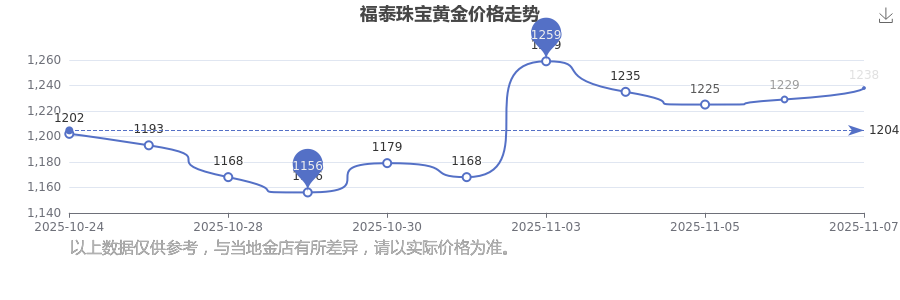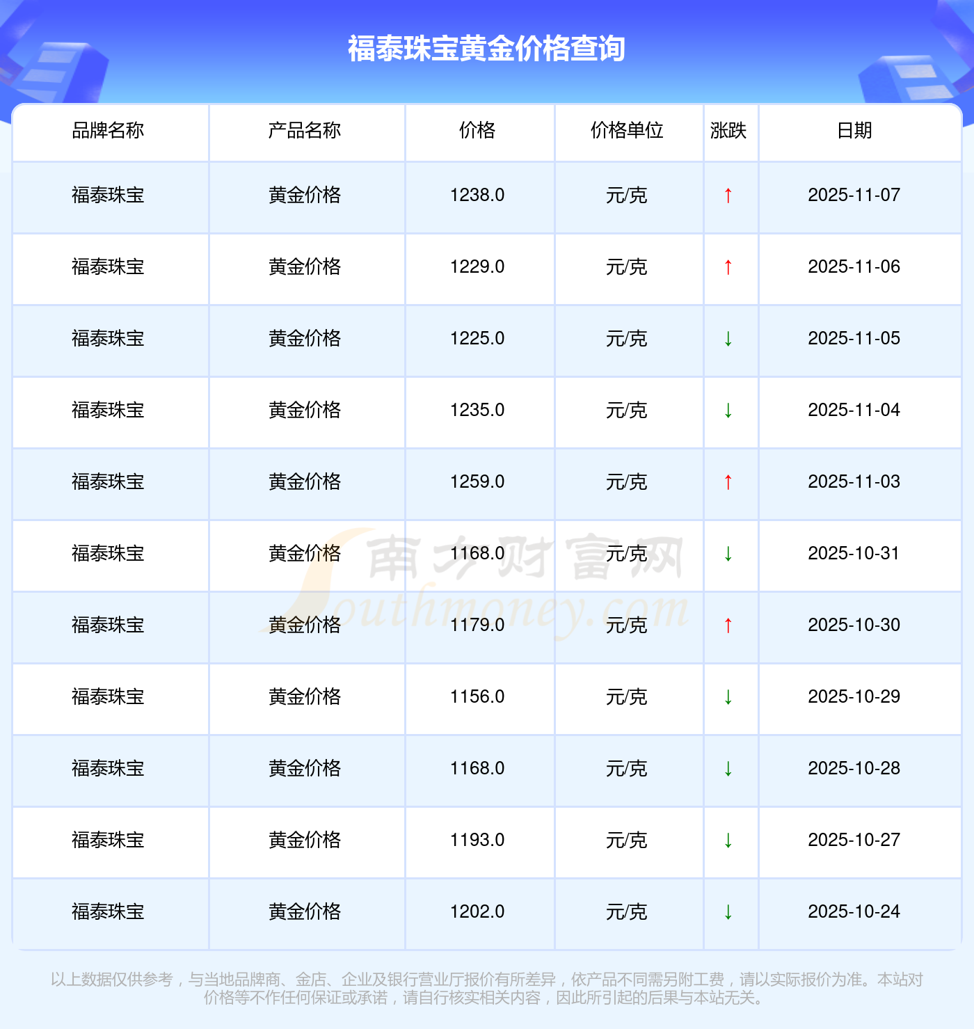 當(dāng)下,福泰珠寶 黃金價(jià)格今日的最新價(jià)格是1238.0元/克。