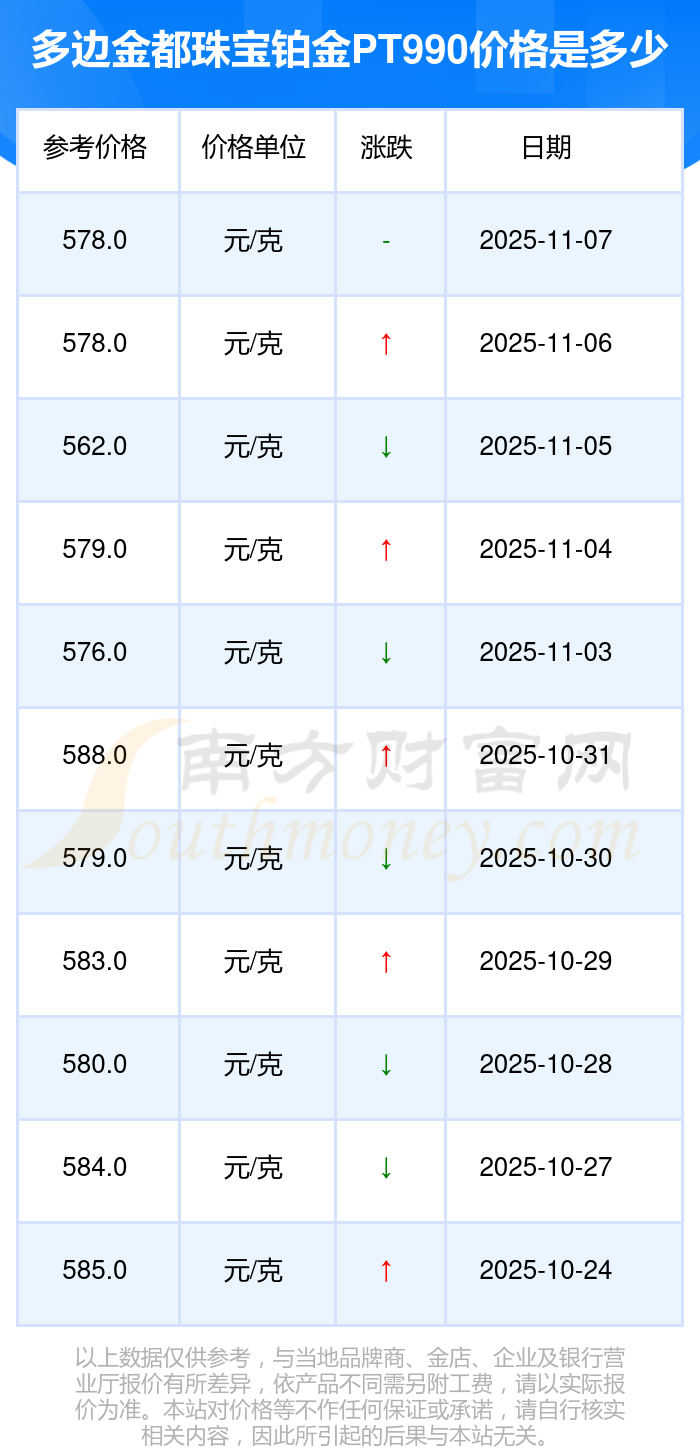 最新數(shù)據(jù)表明,多邊金都珠寶今日 鉑金PT990價格為578.0元/克。