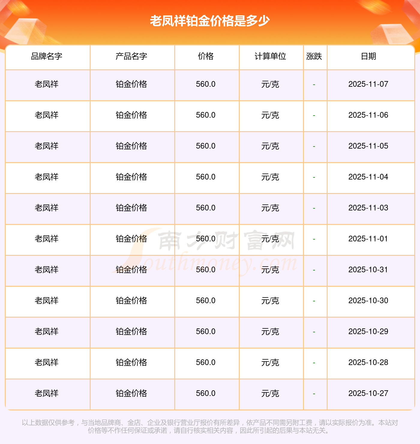 2025年11月9日老鳳祥鉑金價格是560.0元/克。