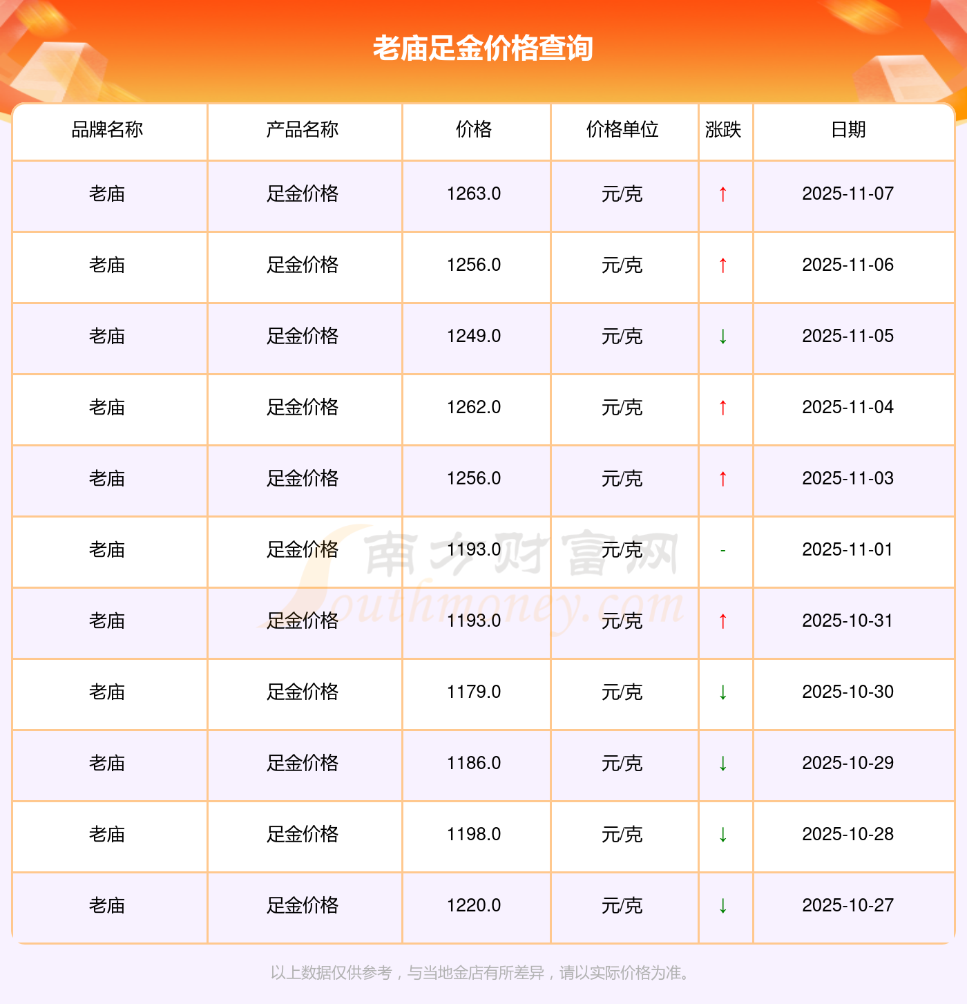 今日老廟 足金價格,最新確定為1263.0元/克。