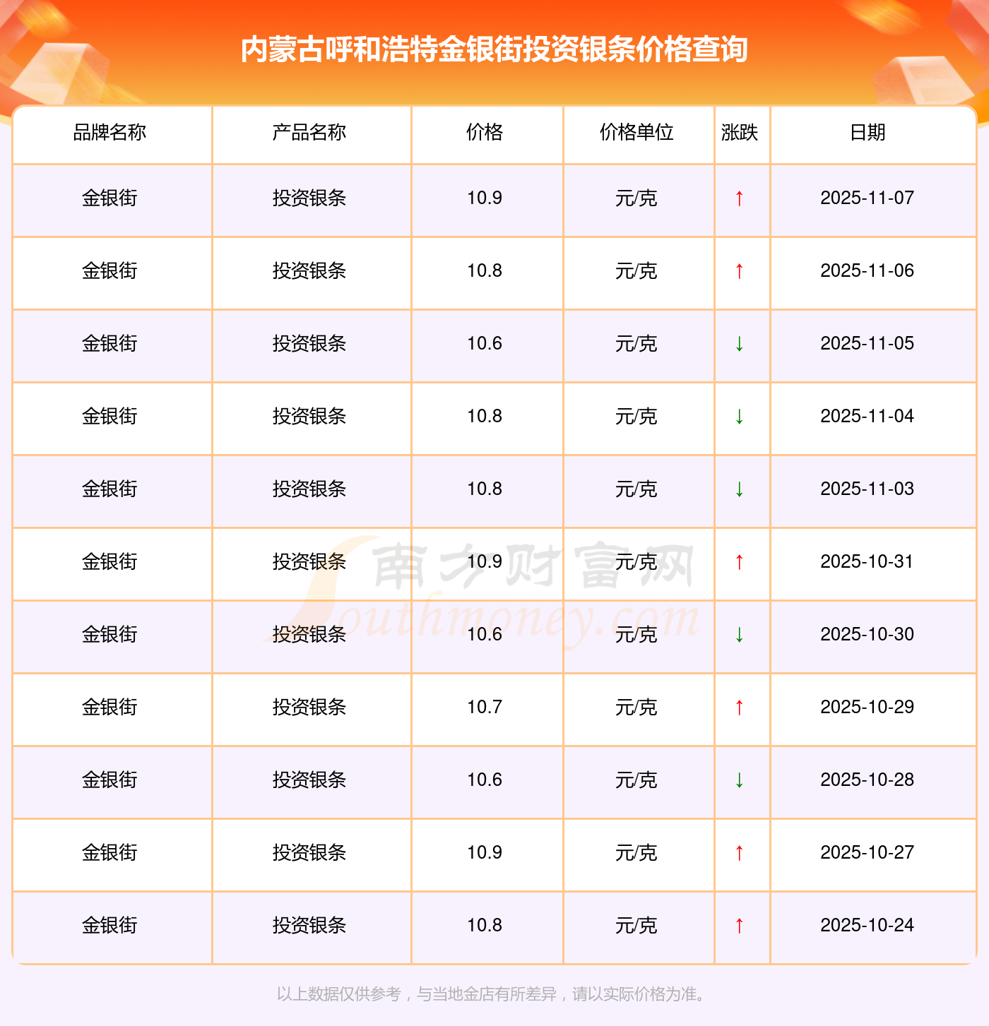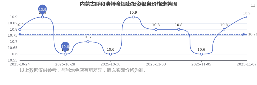10.9元/克,這是內蒙古呼和浩特金銀街于 2025年11月9日所定的投資銀條價格。