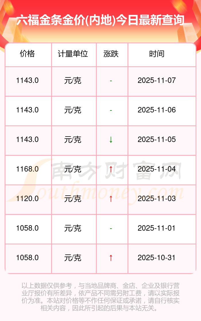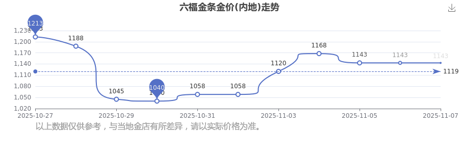 1143.0元/克是六福在今日給出的 金條金價(jià)(內(nèi)地)最新價(jià)格。