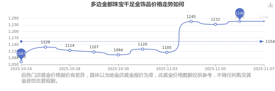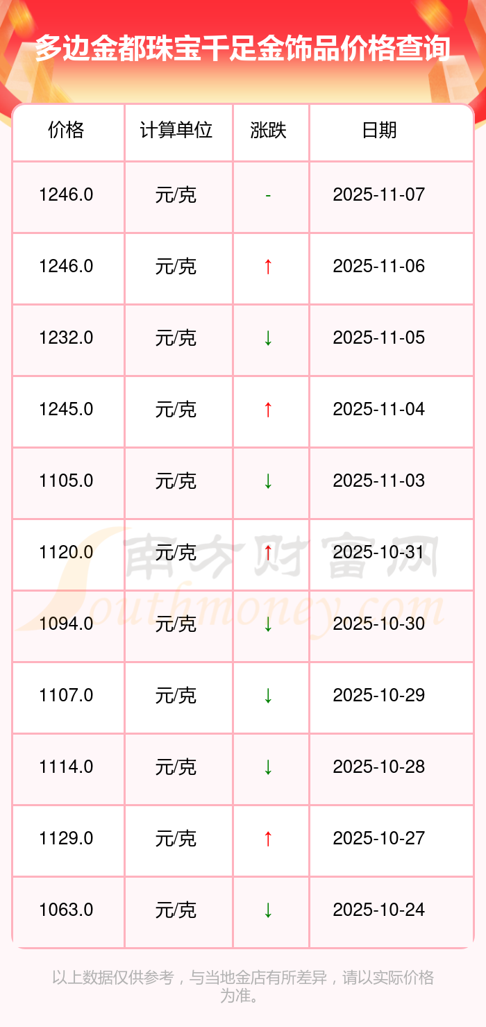 據(jù)了解,今日多邊金都珠寶 千足金飾品的最新價格為1246.0元/克。