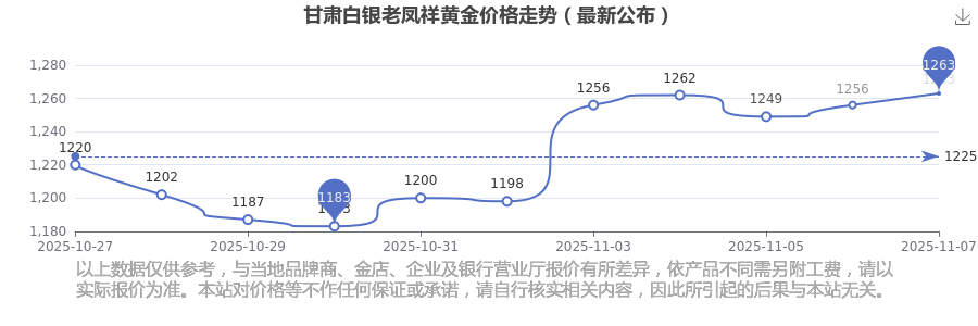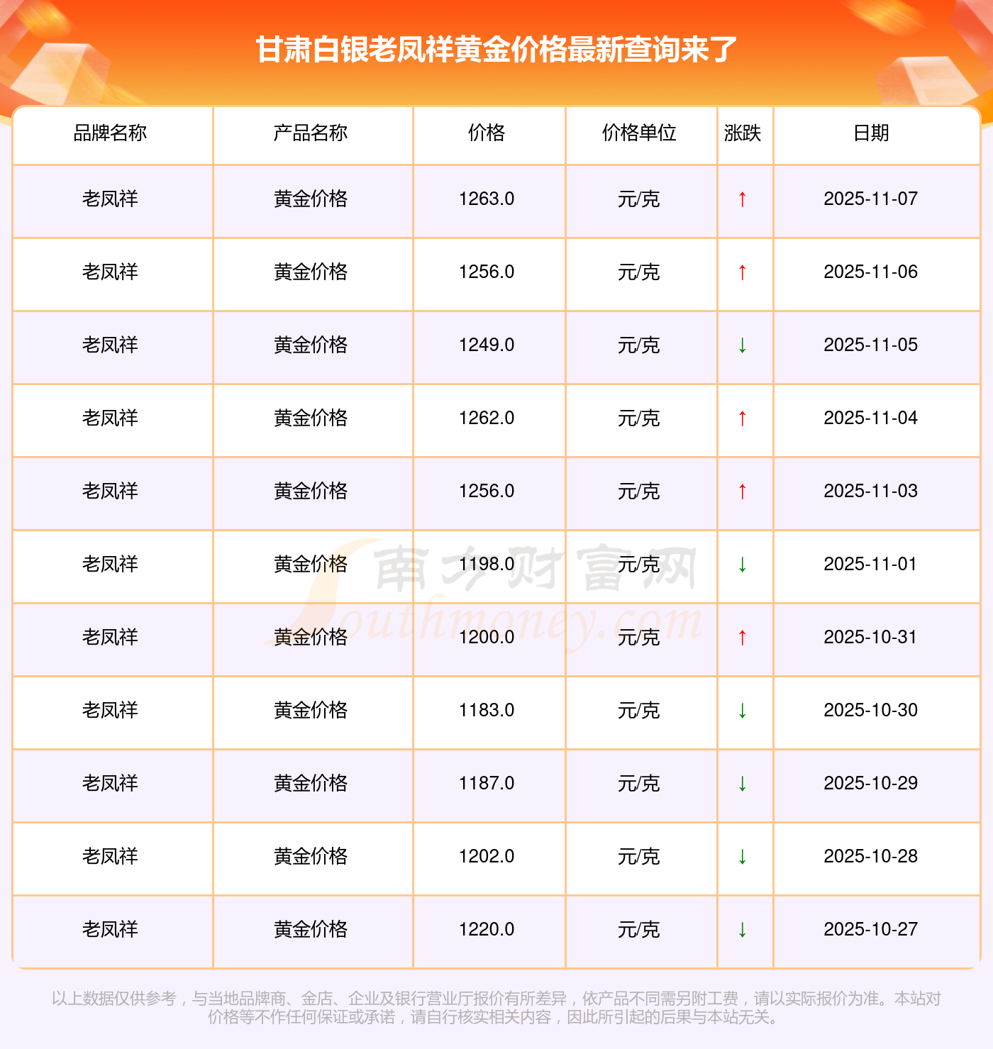 甘肅白銀老鳳祥黃金價格在 2025年11月9日,其市場價格為 1263.0元/克。
