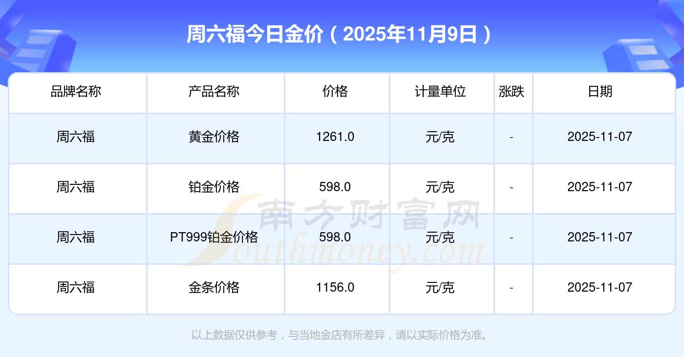 現(xiàn)在周六福黃金價格是多少錢1克_2025年周六福今日金價是多少錢一克,最新周六福查詢,2025年11月9日周六福PT999鉑金價格現(xiàn)在每克多少錢?最新周六福PT999鉑金價格報價公布,一起來看看吧!
