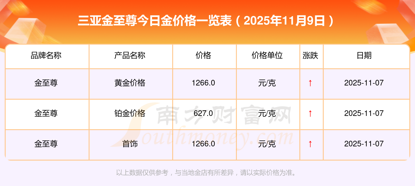 想查詢今天黃金價格,此刻黃金一克的價格是多少呀?2025年11月9日三亞金至尊一克黃金的售價是多少:銀條價格11.4元/克,黃金價格1263.0元/克,鉑金價格560.0元/克,金條價格(內(nèi)地)1202.0元/克,金飾價格(內(nèi)地)1268.0元/克,黃金飾品(香港)44260.0,鉑金飾品(香港)13080.0,金條金價(香港)39960.0,投資金條1243.0元/克,工藝金條1258.0元/克,千足金首飾1248.0元/克。