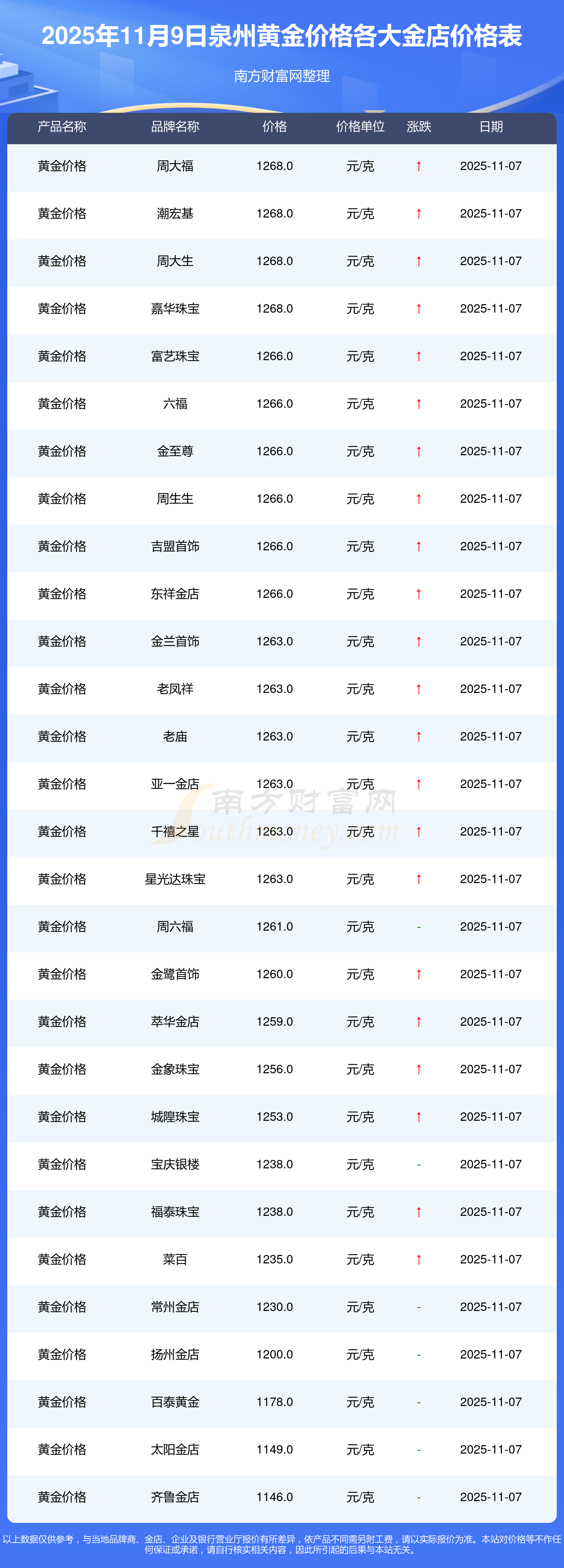 2025年11月9日,泉州寶泉錢幣、金蘭首飾、金蘭首飾、謝瑞麟、謝瑞麟、謝瑞麟、謝瑞麟、謝瑞麟、金銀街、金銀街、金銀街等各大金店品牌黃金價(jià)格今日價(jià)格行情最新來了:寶泉錢幣11.4元/克、金蘭首飾1263.0元/克、金蘭首飾560.0元/克、謝瑞麟1202.0元/克、謝瑞麟1268.0元/克、謝瑞麟44260.0、謝瑞麟13080.0、謝瑞麟39960.0、金銀街1243.0元/克、金銀街1258.0元/克、金銀街1248.0元/克。