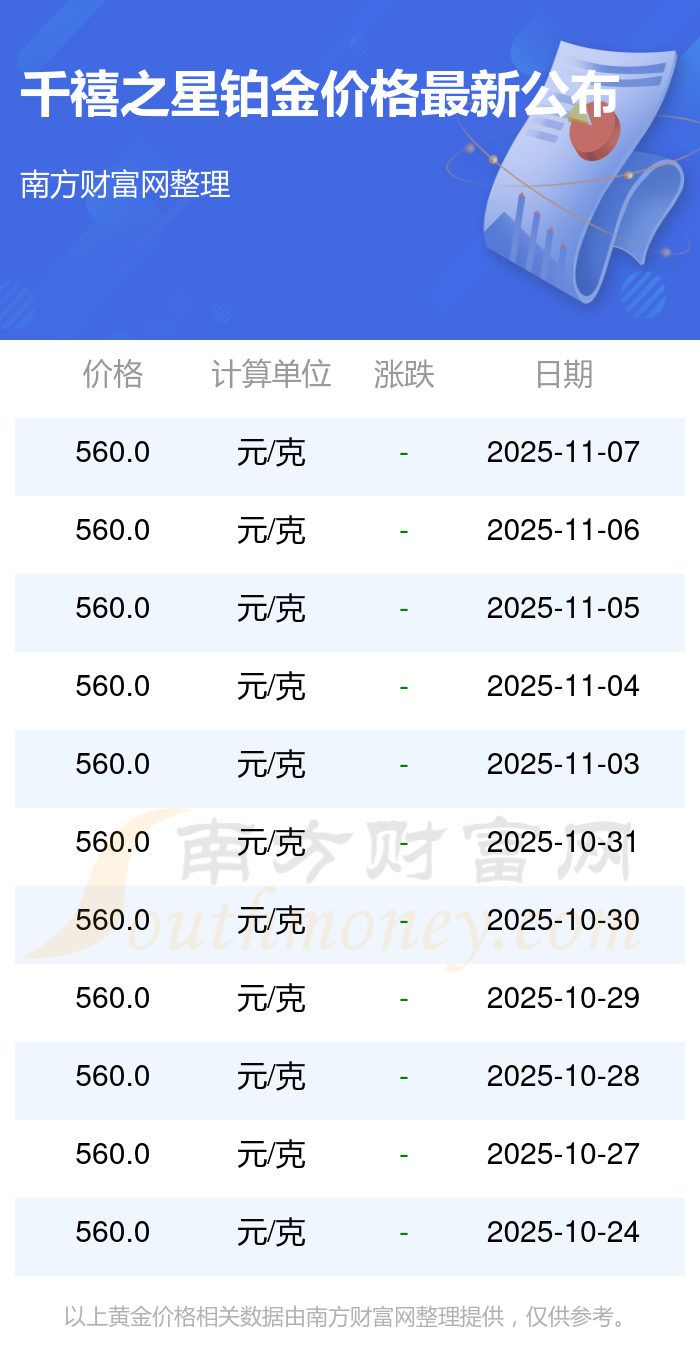 最新數(shù)據(jù)表明,千禧之星今日 鉑金價格為560.0元/克。