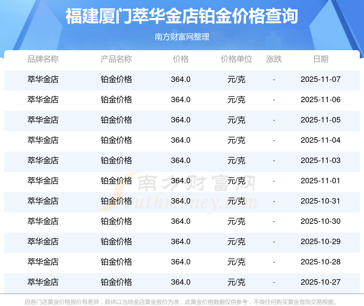 今日(2025年11月9日),福建廈門(mén)萃華金店鉑金價(jià)格每克的價(jià)值為364.0元/克。