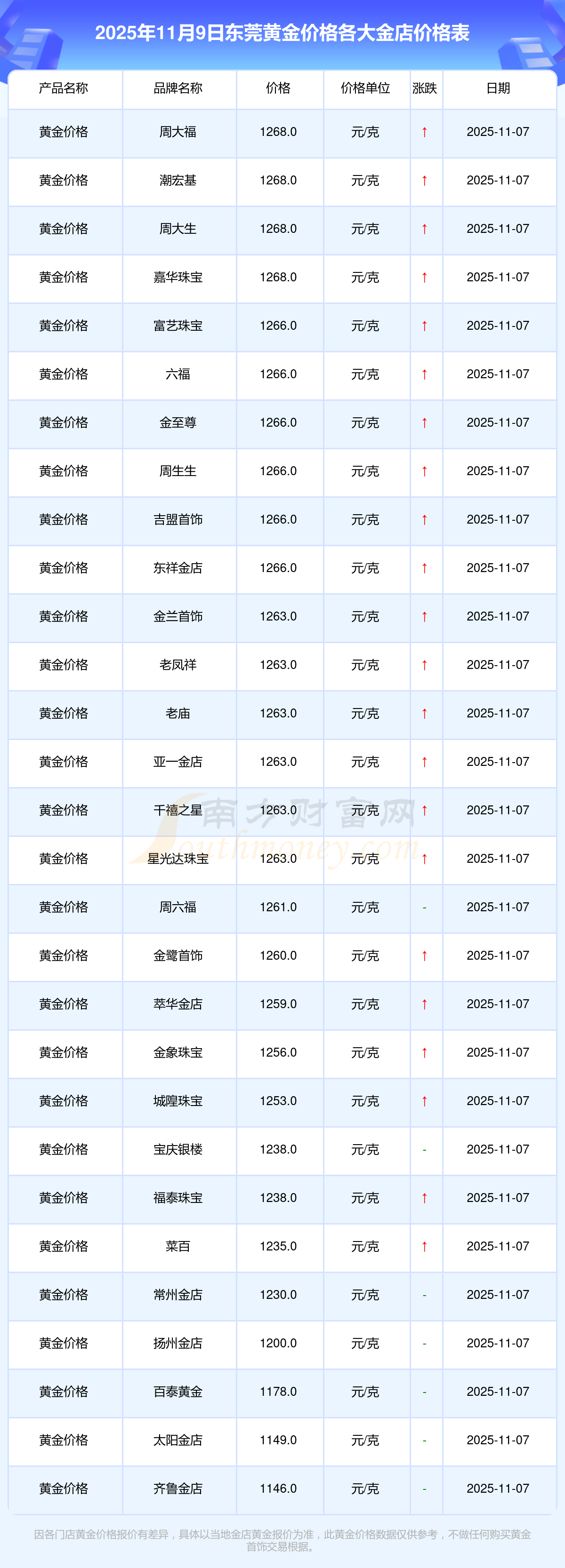 2025年11月9日東莞各大金店黃金價(jià)格最新價(jià)格:寶泉錢幣11.4元/克,金蘭首飾1263.0元/克,金蘭首飾560.0元/克,謝瑞麟1202.0元/克,謝瑞麟1268.0元/克,謝瑞麟44260.0,謝瑞麟13080.0,謝瑞麟39960.0,金銀街1243.0元/克,金銀街1258.0元/克,金銀街1248.0元/克。