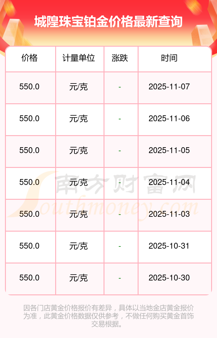 550.0元/克是城隍珠寶在今日給出的 鉑金價格最新價格。