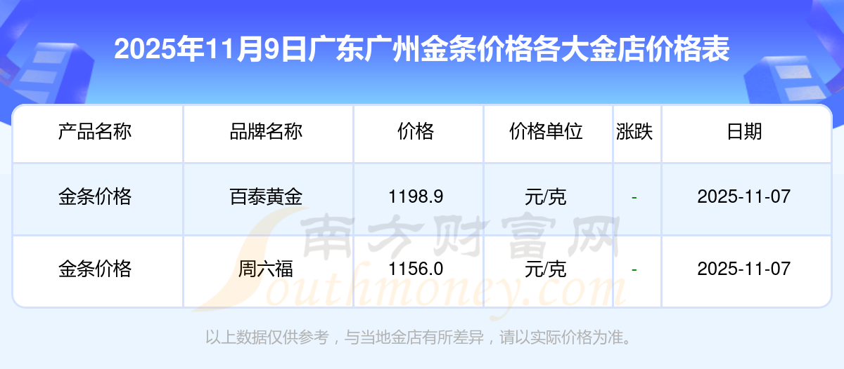 2025年11月9日廣東廣州各大金店金條價格最新價格:寶泉錢幣11.4元/克,金蘭首飾1263.0元/克,金蘭首飾560.0元/克,謝瑞麟1202.0元/克,謝瑞麟1268.0元/克,謝瑞麟44260.0,謝瑞麟13080.0,謝瑞麟39960.0,金銀街1243.0元/克,金銀街1258.0元/克,金銀街1248.0元/克。