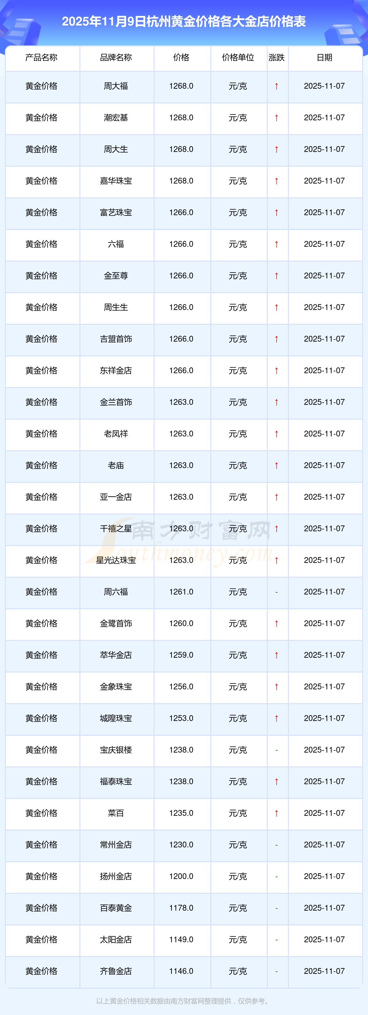 2025年11月9日,杭州寶泉錢幣、金蘭首飾、金蘭首飾、謝瑞麟、謝瑞麟、謝瑞麟、謝瑞麟、謝瑞麟、金銀街、金銀街、金銀街等各大金店品牌黃金價(jià)格今日價(jià)格如下:寶泉錢幣11.4元/克、金蘭首飾1263.0元/克、金蘭首飾560.0元/克、謝瑞麟1202.0元/克、謝瑞麟1268.0元/克、謝瑞麟44260.0、謝瑞麟13080.0、謝瑞麟39960.0、金銀街1243.0元/克、金銀街1258.0元/克、金銀街1248.0元/克。