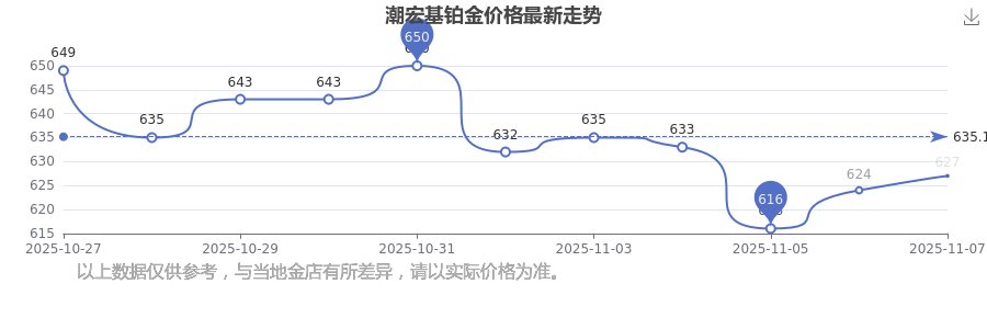 今日潮宏基鉑金價格的價格是627.0元/克。