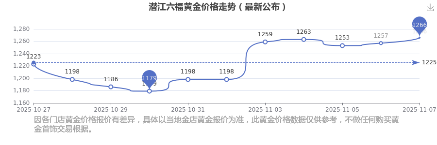 2025年11月9日,潛江六福黃金價(jià)格每克的售賣(mài)價(jià)位為1266.0元/克。