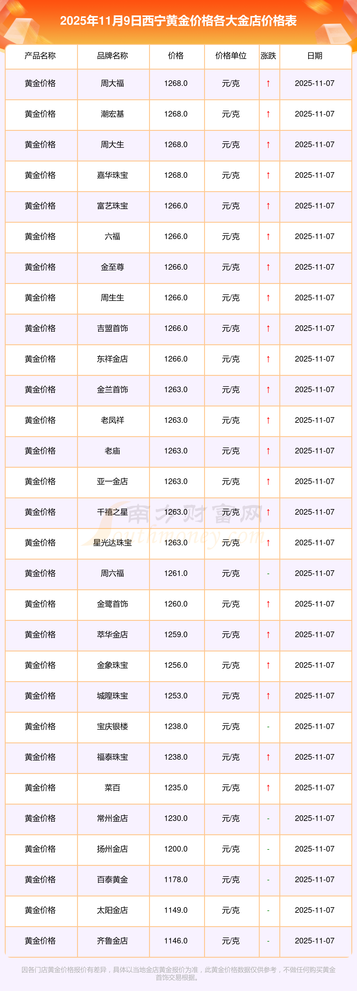 2025年11月9日,西寧寶泉錢幣、金蘭首飾、金蘭首飾、謝瑞麟、謝瑞麟、謝瑞麟、謝瑞麟、謝瑞麟、金銀街、金銀街、金銀街等各大金店品牌黃金價(jià)格今日價(jià)格如下:寶泉錢幣11.4元/克、金蘭首飾1263.0元/克、金蘭首飾560.0元/克、謝瑞麟1202.0元/克、謝瑞麟1268.0元/克、謝瑞麟44260.0、謝瑞麟13080.0、謝瑞麟39960.0、金銀街1243.0元/克、金銀街1258.0元/克、金銀街1248.0元/克。