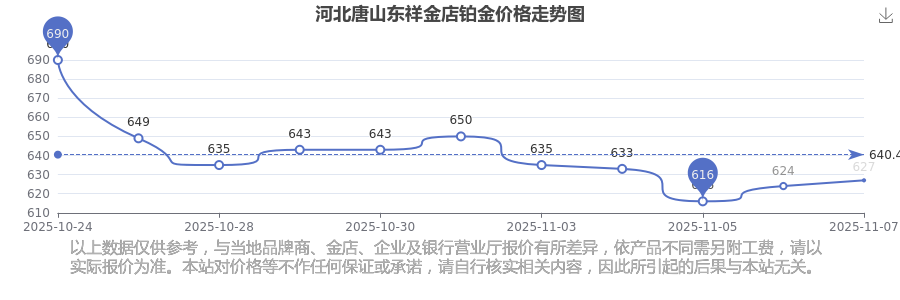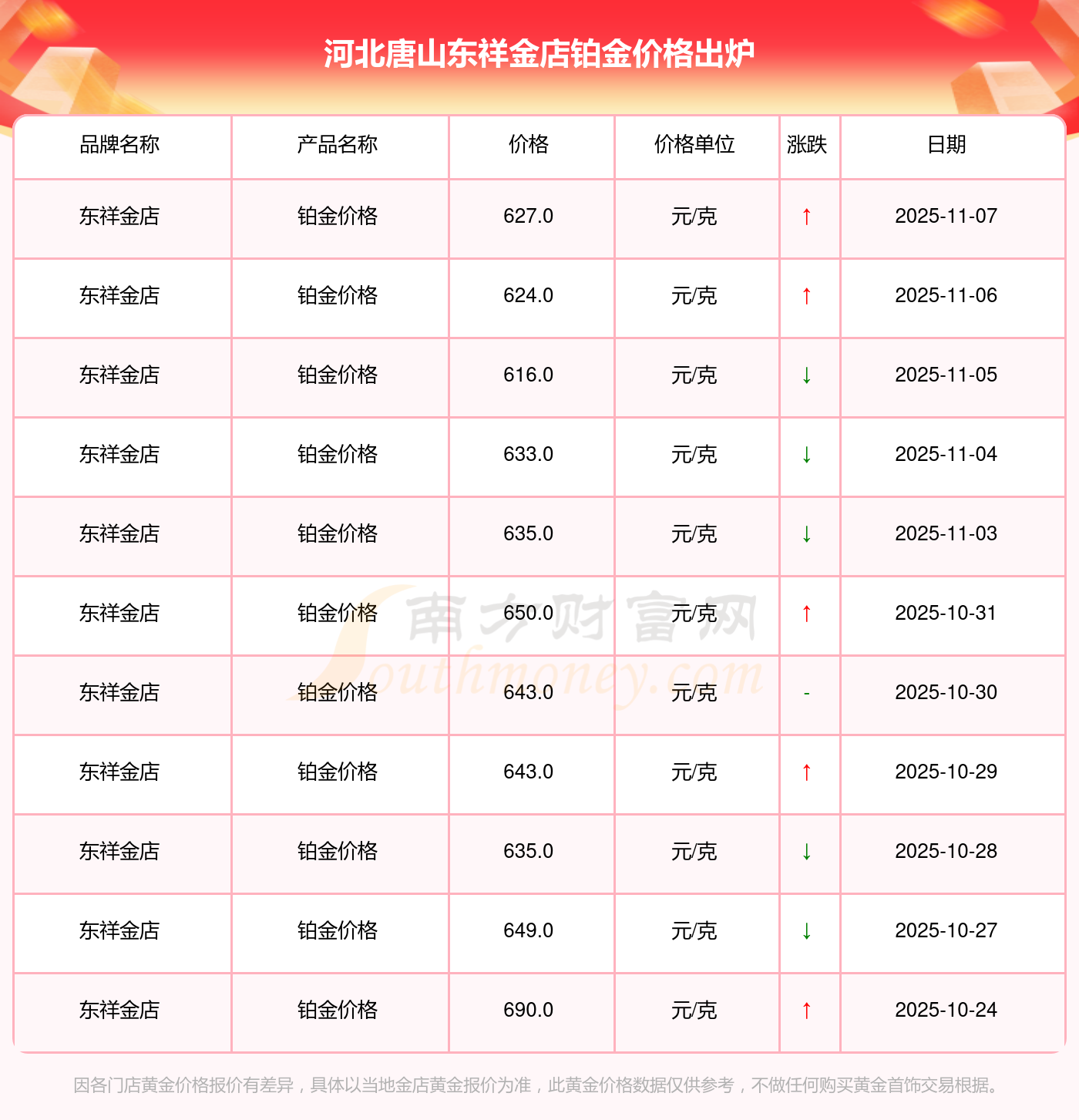 今日河北唐山東祥金店鉑金價格是627.0元/克。