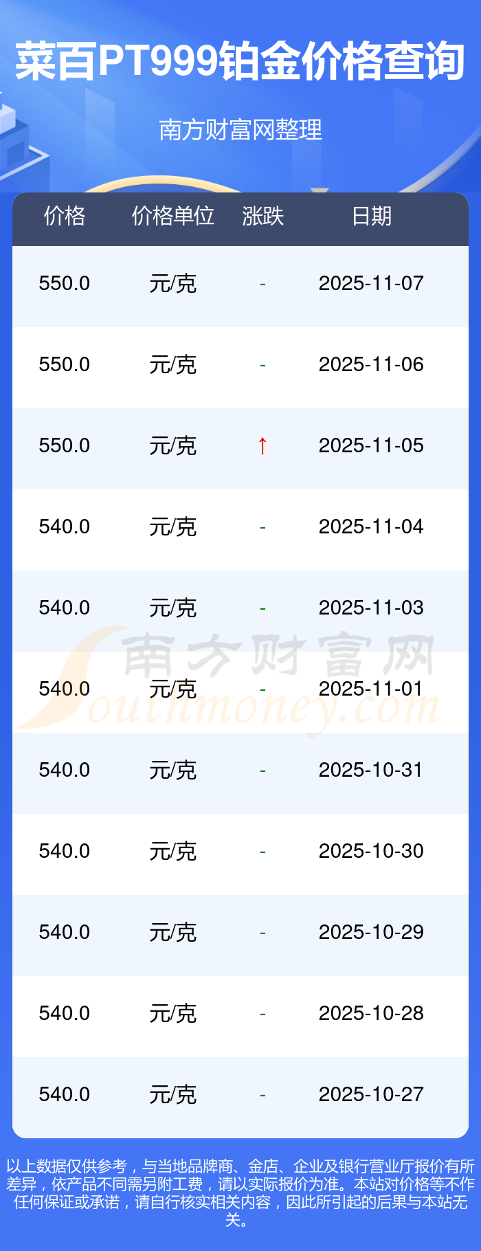550.0元/克的價格,是菜百今日 PT999鉑金的最新行情。