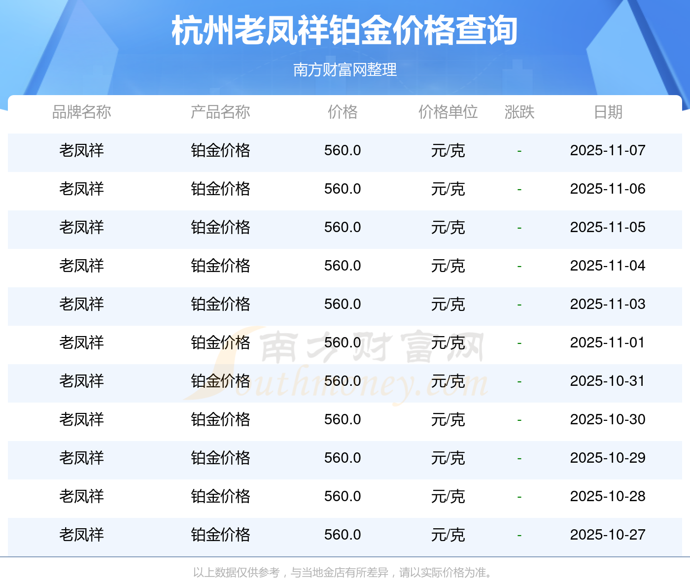 杭州老鳳祥鉑金價格現(xiàn)在每克多少錢,今日黃金一克的標價是多少?今日杭州老鳳祥鉑金價格查詢,2025年11月9日,杭州老鳳祥所售鉑金價格,其價格設定為 560.0元/克。