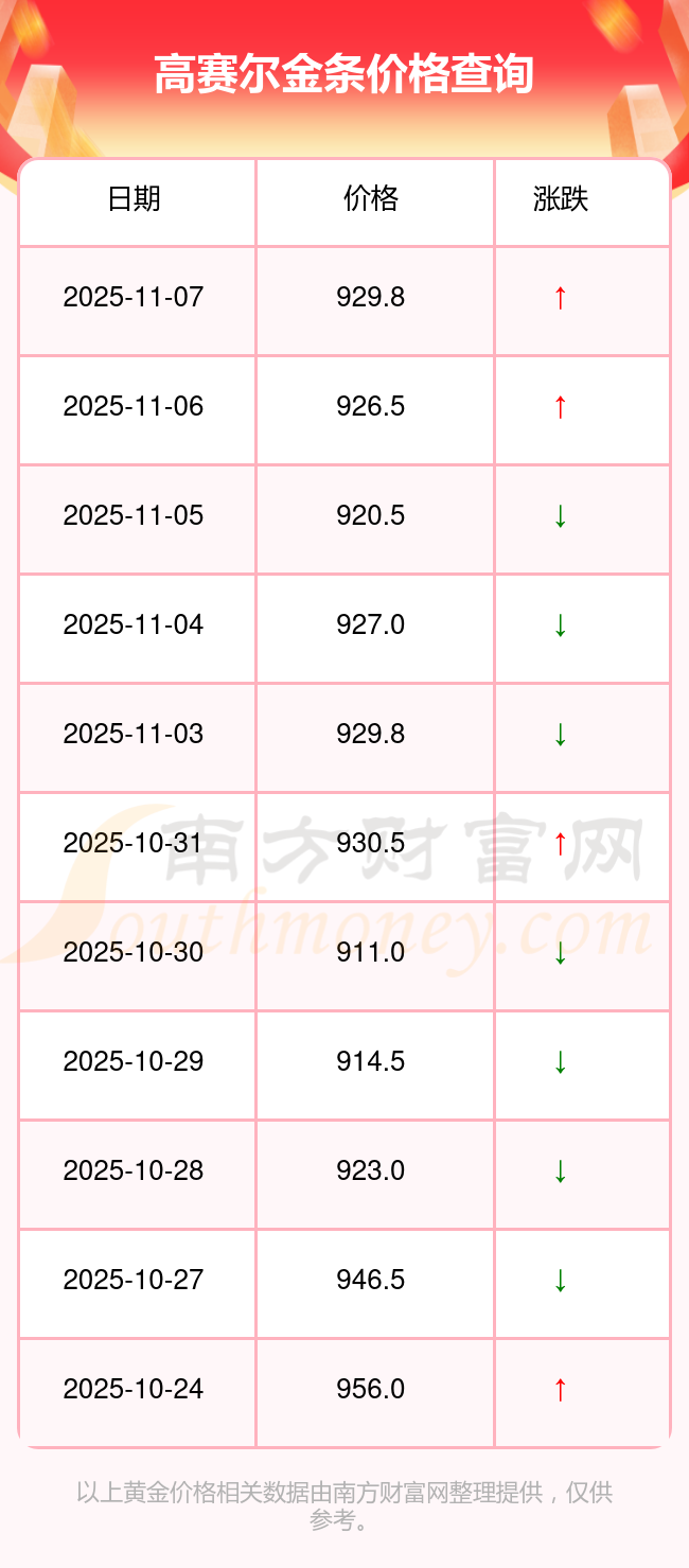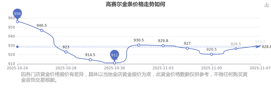 今日(2025年11月9日),高賽爾金條價(jià)格:929.8元/克。