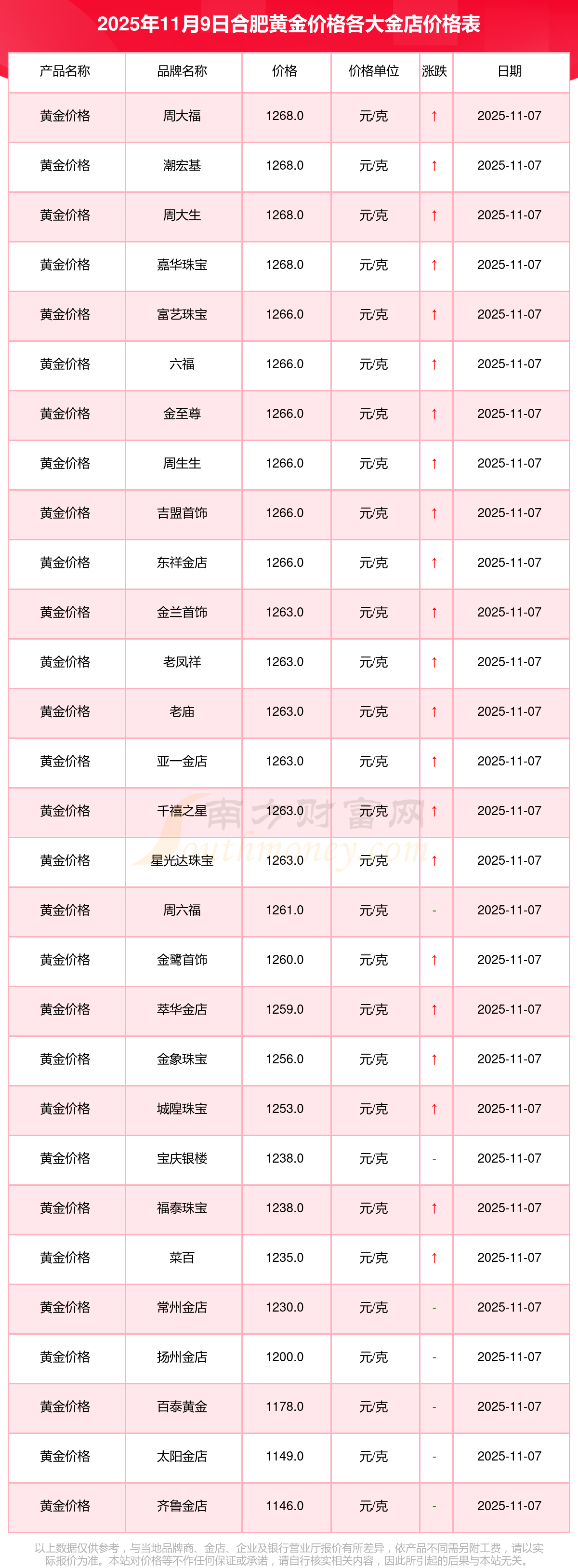 2025年11月9日合肥各大金店黃金價格最新價格:寶泉錢幣11.4元/克,金蘭首飾1263.0元/克,金蘭首飾560.0元/克,謝瑞麟1202.0元/克,謝瑞麟1268.0元/克,謝瑞麟44260.0,謝瑞麟13080.0,謝瑞麟39960.0,金銀街1243.0元/克,金銀街1258.0元/克,金銀街1248.0元/克。