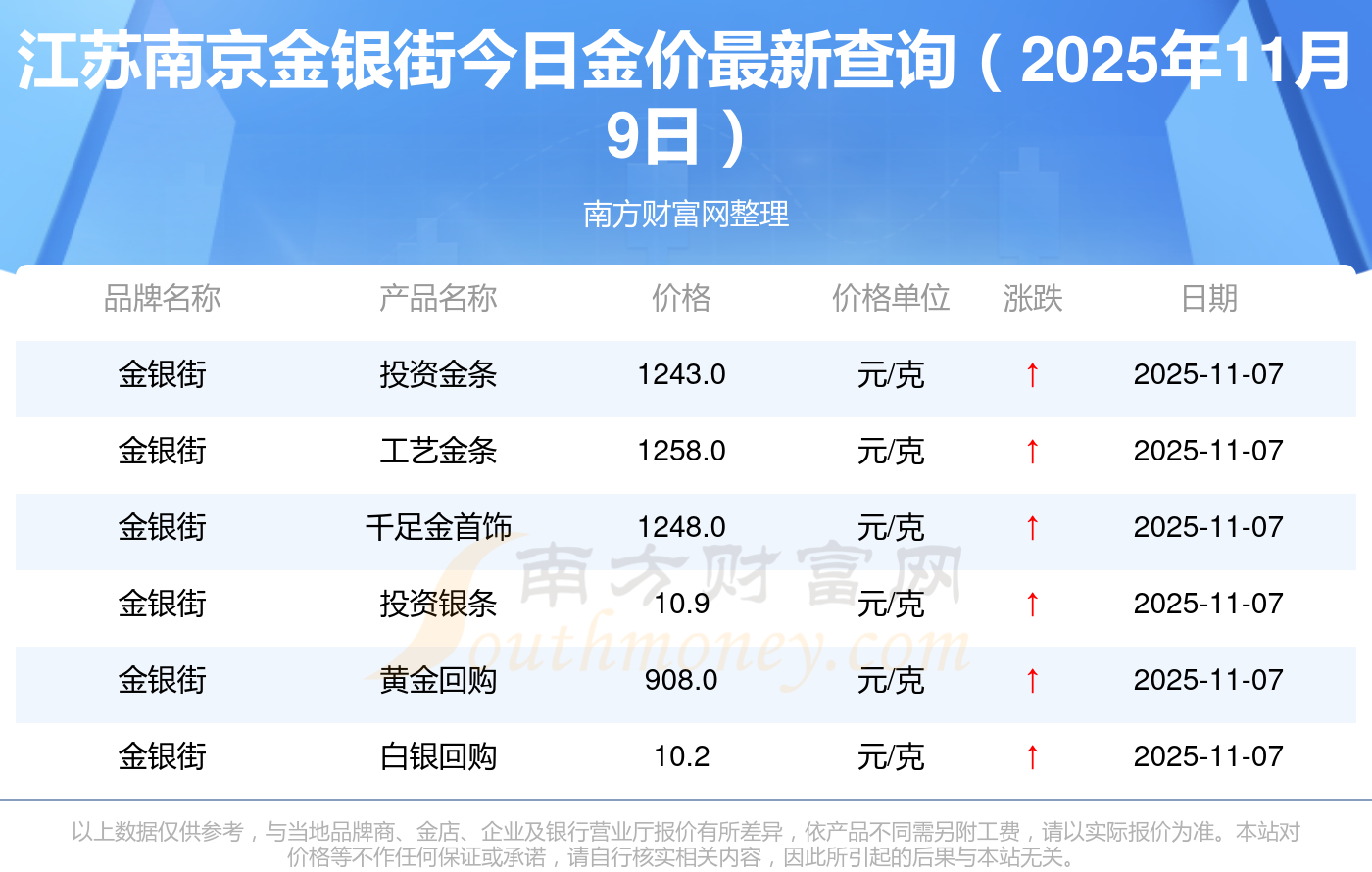 今日黃金售價(jià)是多少呢?此刻每克黃金價(jià)錢怎樣? 2025年11月9日江蘇南京金銀街一克黃金對(duì)應(yīng)的價(jià)格是多少?銀條價(jià)格11.4元/克,黃金價(jià)格1263.0元/克,鉑金價(jià)格560.0元/克,金條價(jià)格(內(nèi)地)1202.0元/克,金飾價(jià)格(內(nèi)地)1268.0元/克,黃金飾品(香港)44260.0,鉑金飾品(香港)13080.0,金條金價(jià)(香港)39960.0,投資金條1243.0元/克,工藝金條1258.0元/克,千足金首飾1248.0元/克。