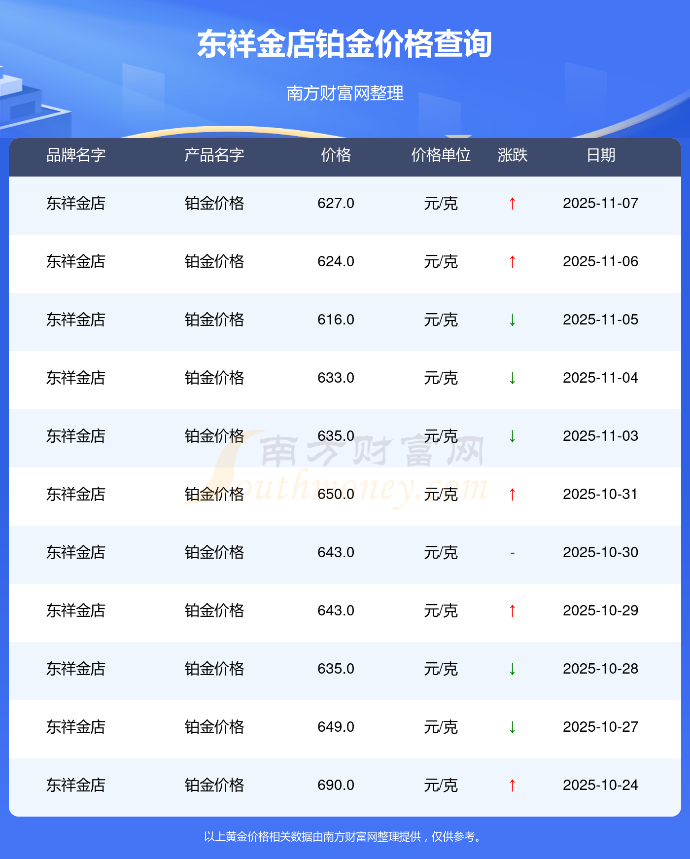東祥金店今日鉑金價(jià)格的最新市場(chǎng)行情價(jià)為627.0元/克。