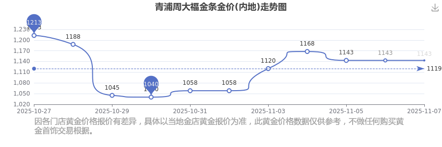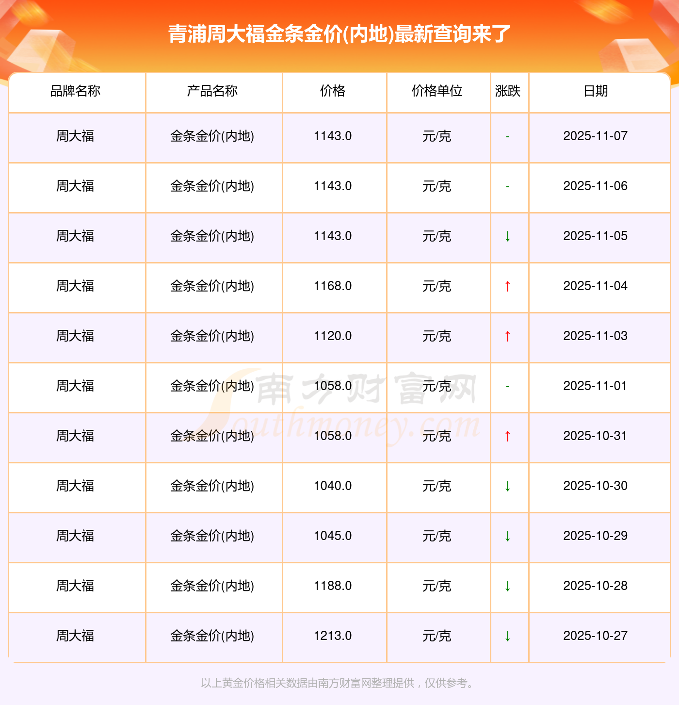 2025年11月9日當天,青浦周大福金條金價(內地)的單價是 1143.0元/克。