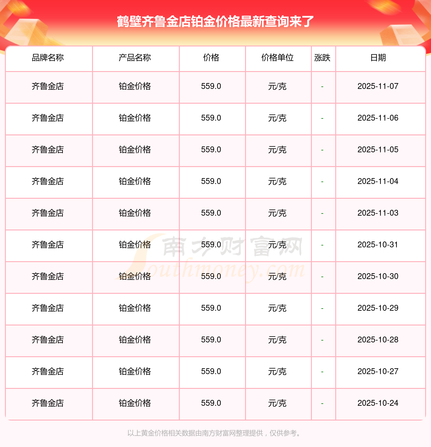 今日2025年11月9日,鶴壁齊魯金店鉑金價格為559.0元/克。