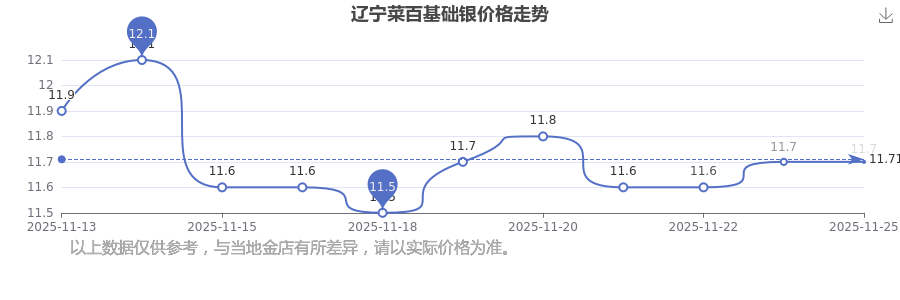 (2025年11月25日)遼寧菜百基礎(chǔ)銀價(jià)格現(xiàn)在為11.7元/克。