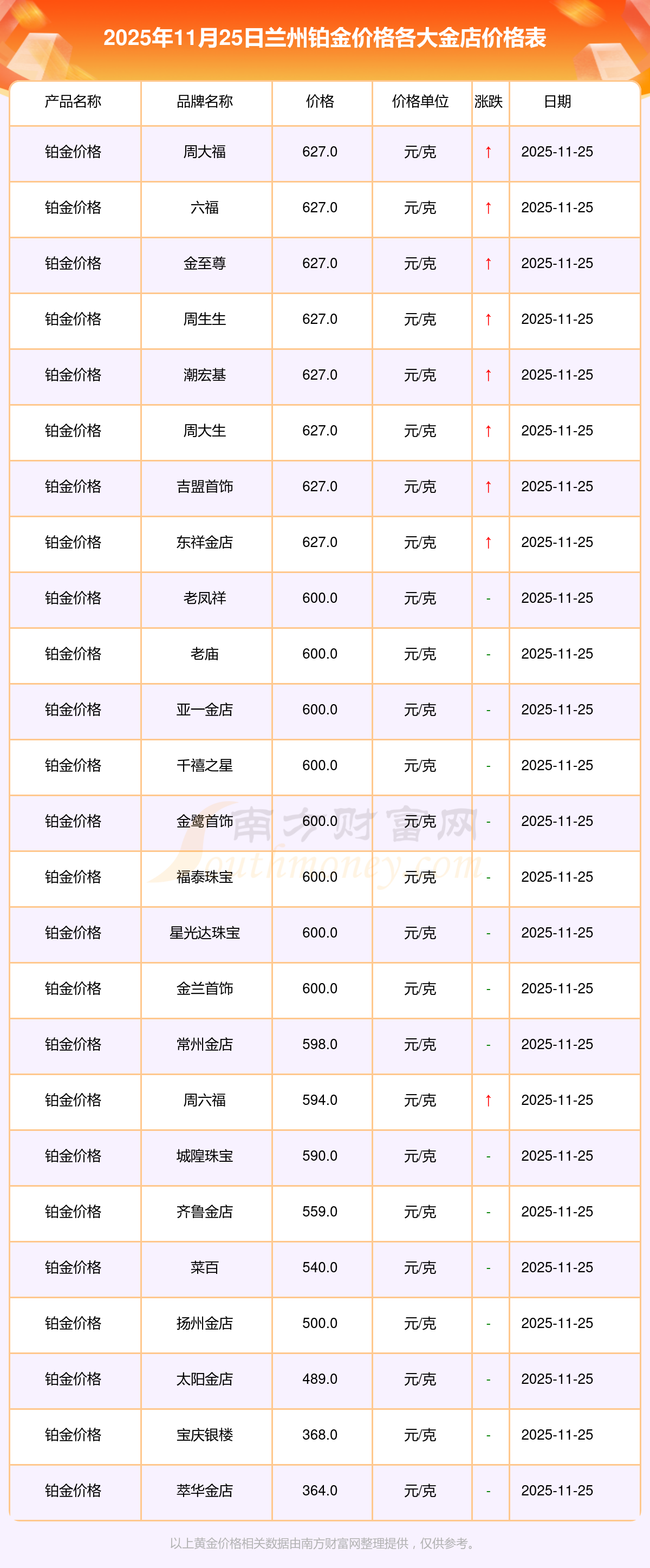 2025年11月25日蘭州各大金店鉑金價(jià)格最新價(jià)格查詢來(lái)了:周大福1312.0元/克,周大福627.0元/克,周大福1312.0元/克,周大福45780.0,周大福17900.0,周大福41290.0,周大福1148.0元/克,老鳳祥1315.0元/克,老鳳祥600.0元/克,老鳳祥1315.0元/克,周六福1278.0元/克。