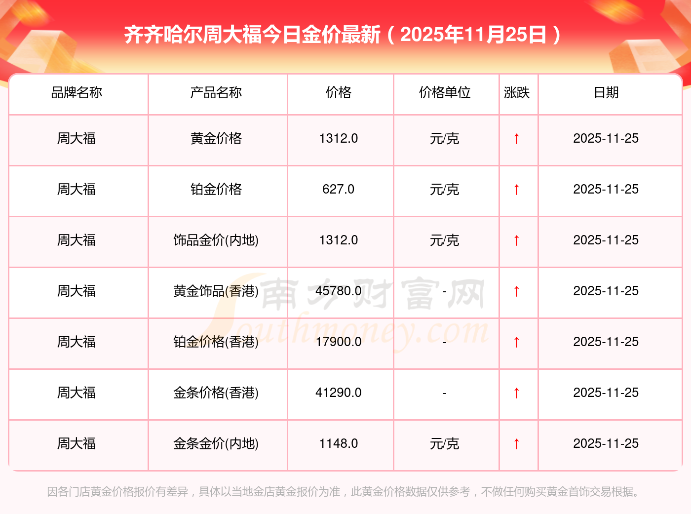 2025年11月25日齊齊哈爾周大福現(xiàn)在黃金一克要多少錢:黃金價格1312.0元/克,鉑金價格627.0元/克,飾品金價(內(nèi)地)1312.0元/克,黃金飾品(香港)45780.0,鉑金價格(香港)17900.0,金條價格(香港)41290.0,金條金價(內(nèi)地)1148.0元/克,黃金價格1315.0元/克,鉑金價格600.0元/克,足金價格1315.0元/克,黃金價格1278.0元/克。