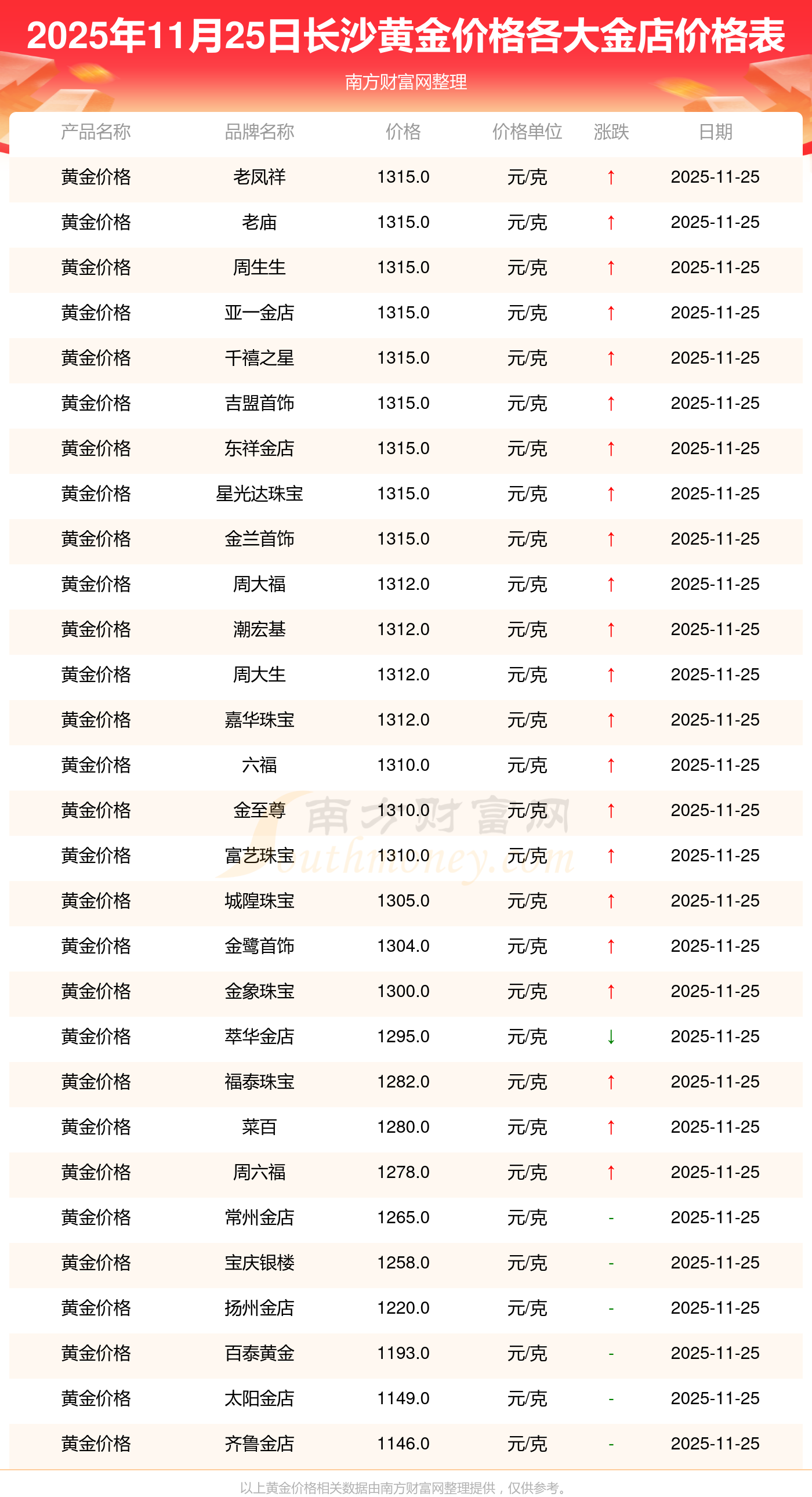 2025年11月25日長沙各大金店黃金價格最新價格查詢來了:周大福1312.0元/克,周大福627.0元/克,周大福1312.0元/克,周大福45780.0,周大福17900.0,周大福41290.0,周大福1148.0元/克,老鳳祥1315.0元/克,老鳳祥600.0元/克,老鳳祥1315.0元/克,周六福1278.0元/克。