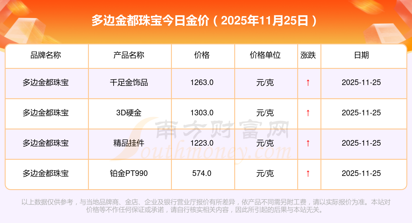 2025年11月25日多邊金都珠寶今日價格:黃金價格1312.0元/克,鉑金價格627.0元/克,飾品金價(內(nèi)地)1312.0元/克,黃金飾品(香港)45780.0,鉑金價格(香港)17900.0,金條價格(香港)41290.0,金條金價(內(nèi)地)1148.0元/克,黃金價格1315.0元/克,鉑金價格600.0元/克,足金價格1315.0元/克,黃金價格1278.0元/克。